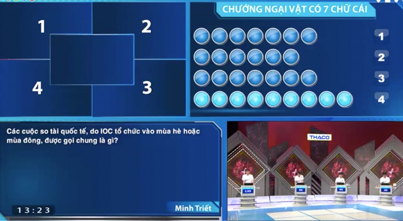 Phần thi Vượt chướng ngại vật với ẩn số cần tìm gồm 7 chữ cái. Minh Triết là thí sinh được quyền lựa chọn hàng ngang đầu tiên, đã chọn ô số 4 với câu hỏi: Các cuộc so tài quốc tế, do IOC tổ chức vào mùa hè hoặc mùa đông, được gọi chung là gì?