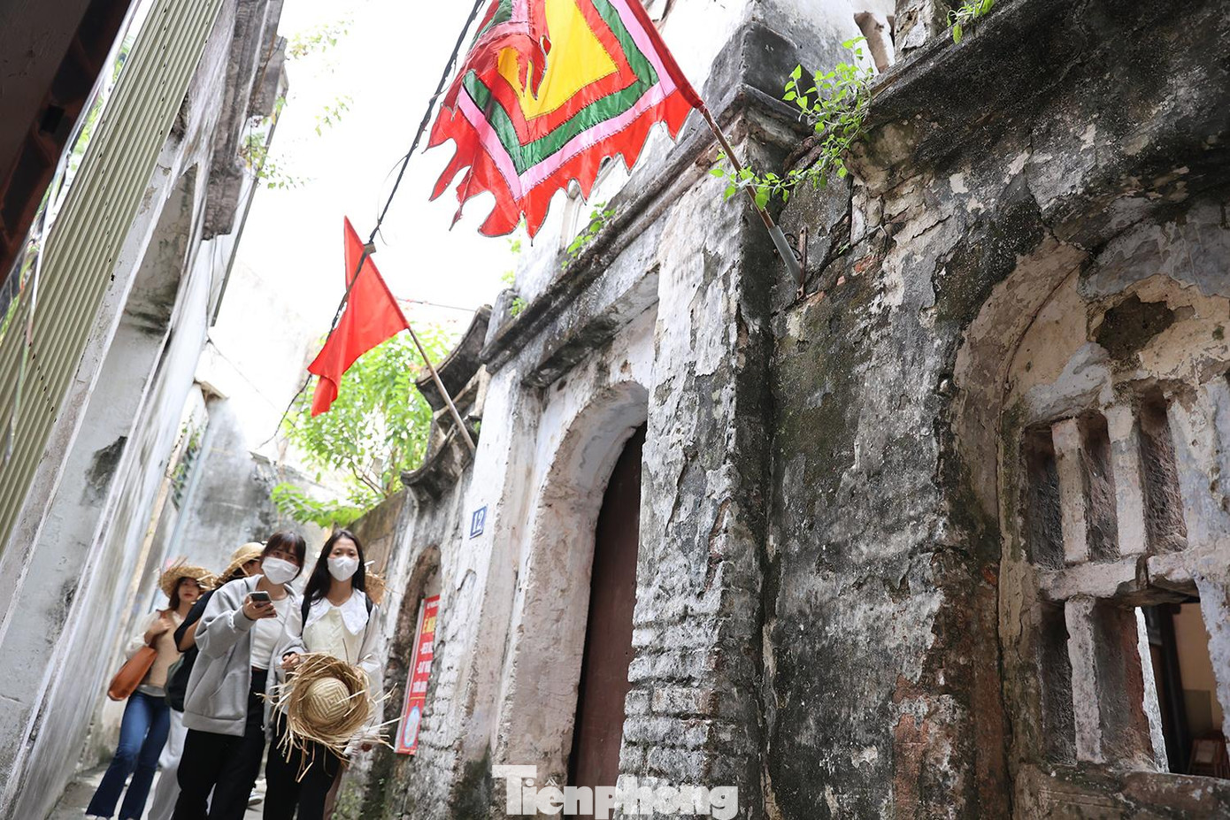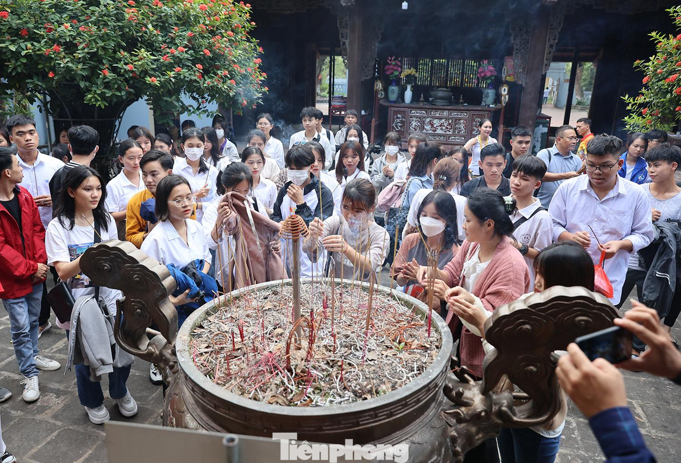 | Các bạn sinh viên được hướng dẫn viên Công ty cổ phần Thăng Long GTC - đơn vị vận hành tuyến du lịch giới thiệu về lịch sử đền thờ Chử Đồng Tử |