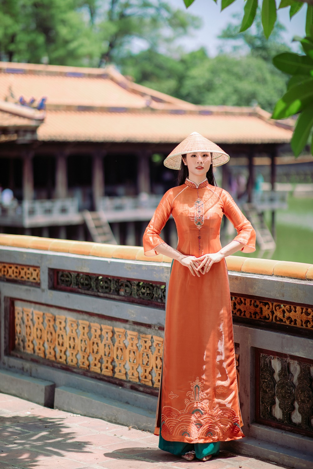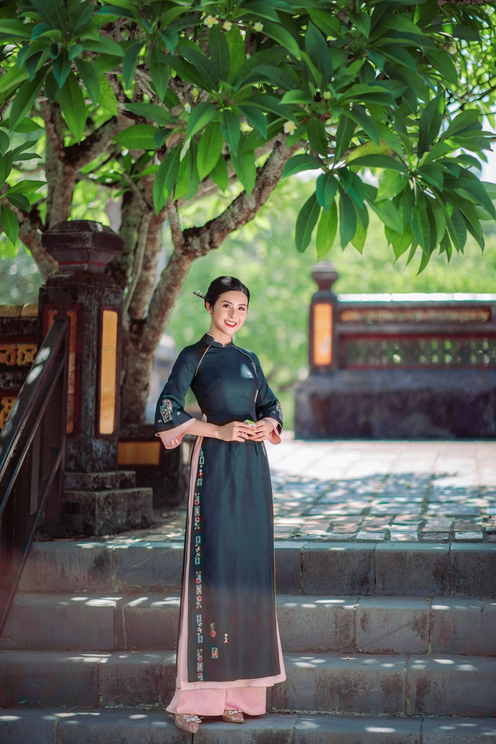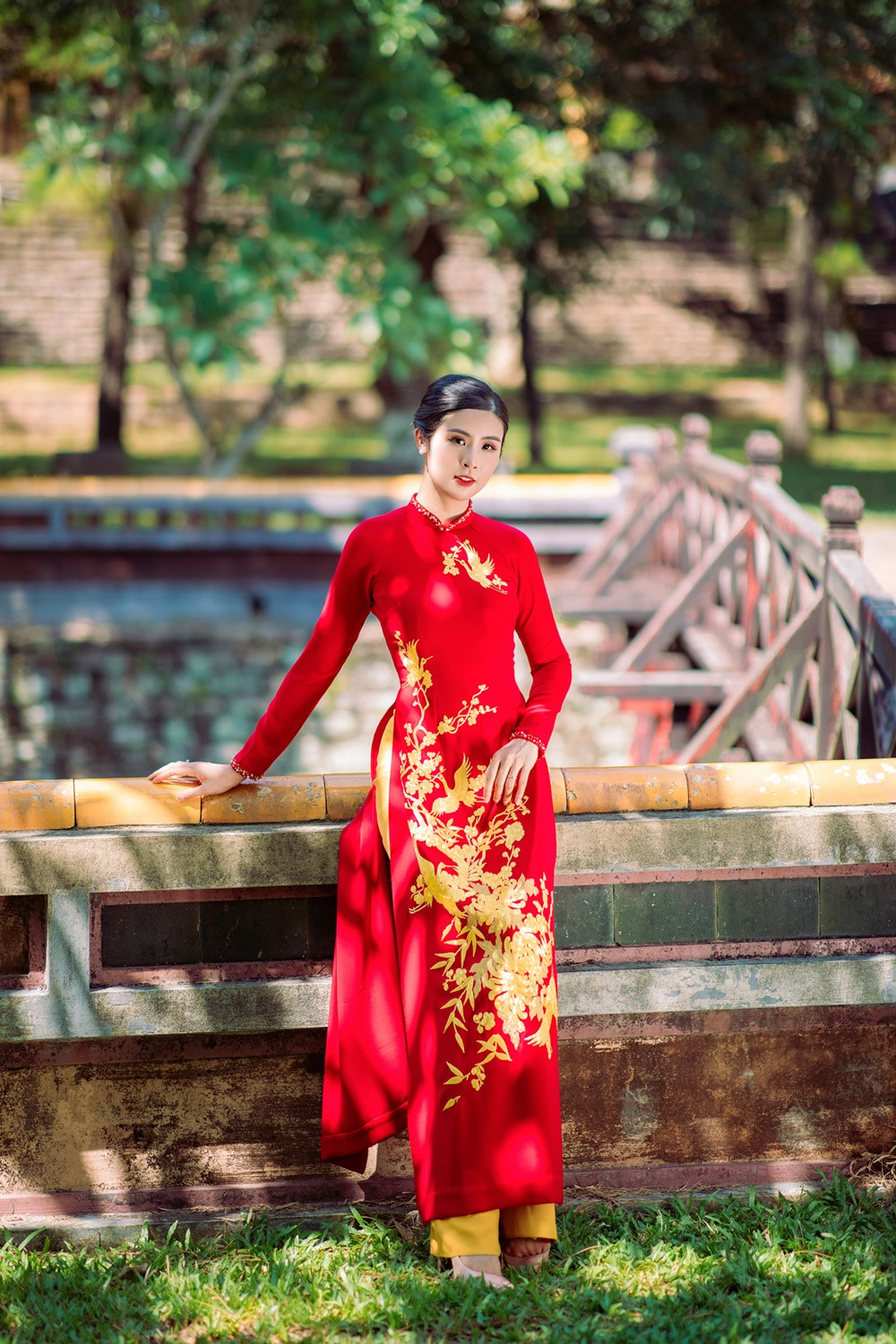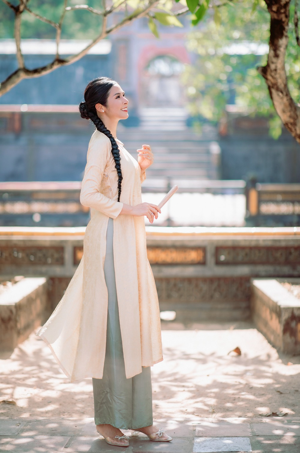 Tranh thủ chuyến đi này, Ngọc Hân còn mang bộ sưu tập áo dài Thu - Đông mà cô mới hoàn thiện để chụp hình tại lăng Tự Đức. Trong suốt một ngày Ngọc Hân làm người mẫu, ông xã nàng hậu âm thầm ở phía sau ủng hộ công việc của vợ dù không xuất hiện trong bất cứ một khung ảnh nào.