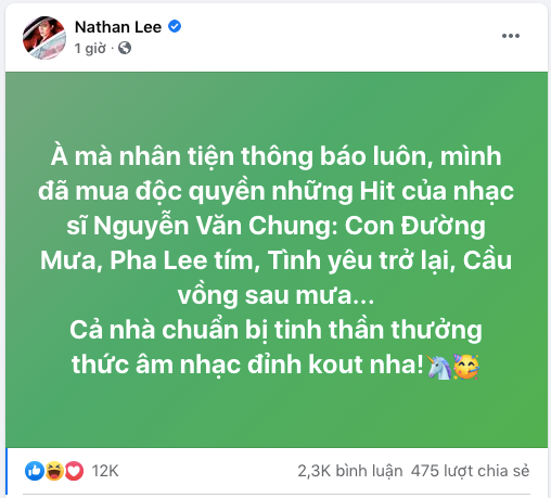 Vừa mới đây, Nathan Lee thông báo rằng anh đã mua độc quyền các ca khúc Con đường mưa, Pha lê tím, Tình yêu trở lại, Cầu vồng sau mưa do nhạc sĩ Nguyễn Văn Chung sáng tác. Việc một ca sĩ mua độc quyền ca khúc, chỉ để riêng mình hát là chuyện thường gặp ở V-biz.