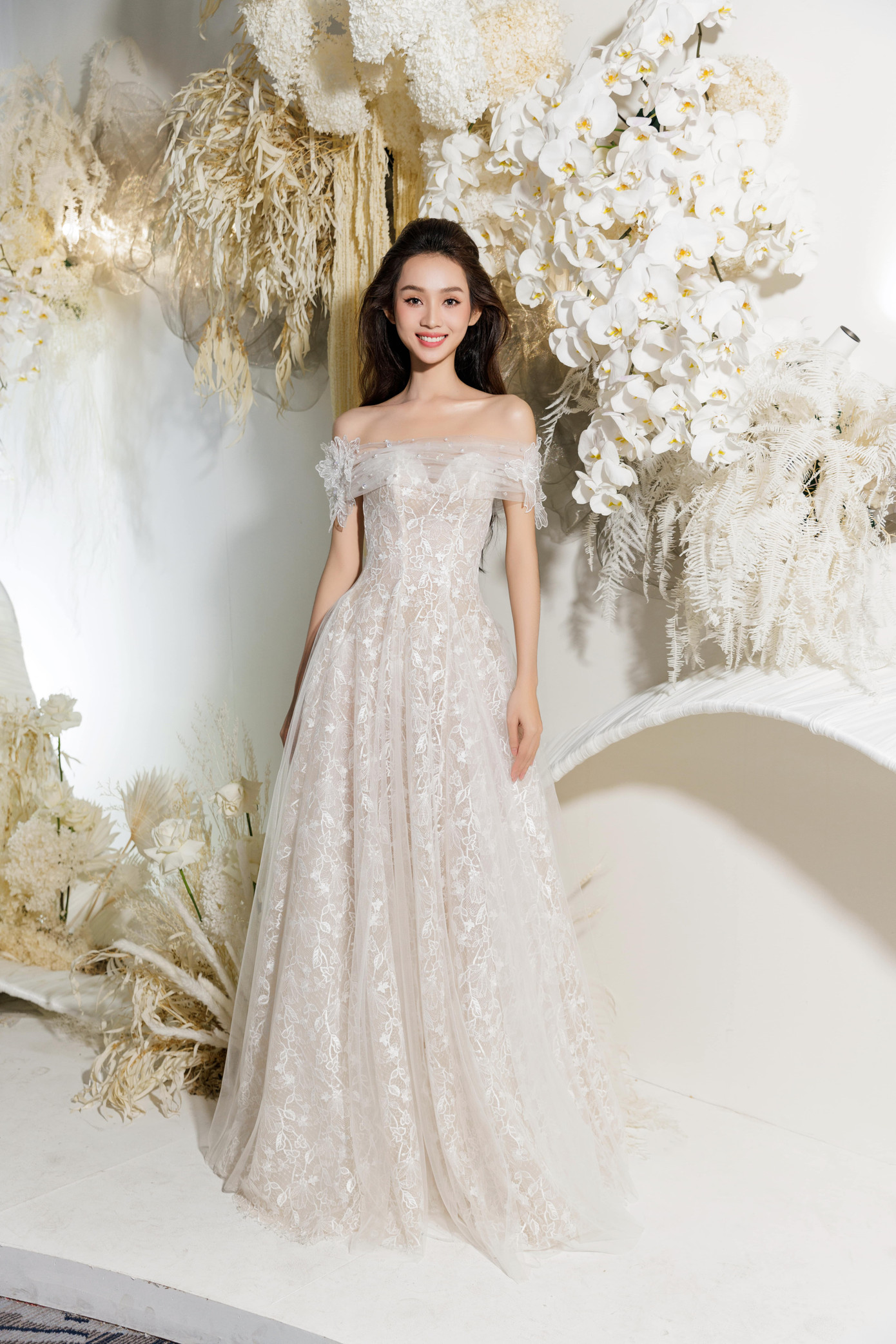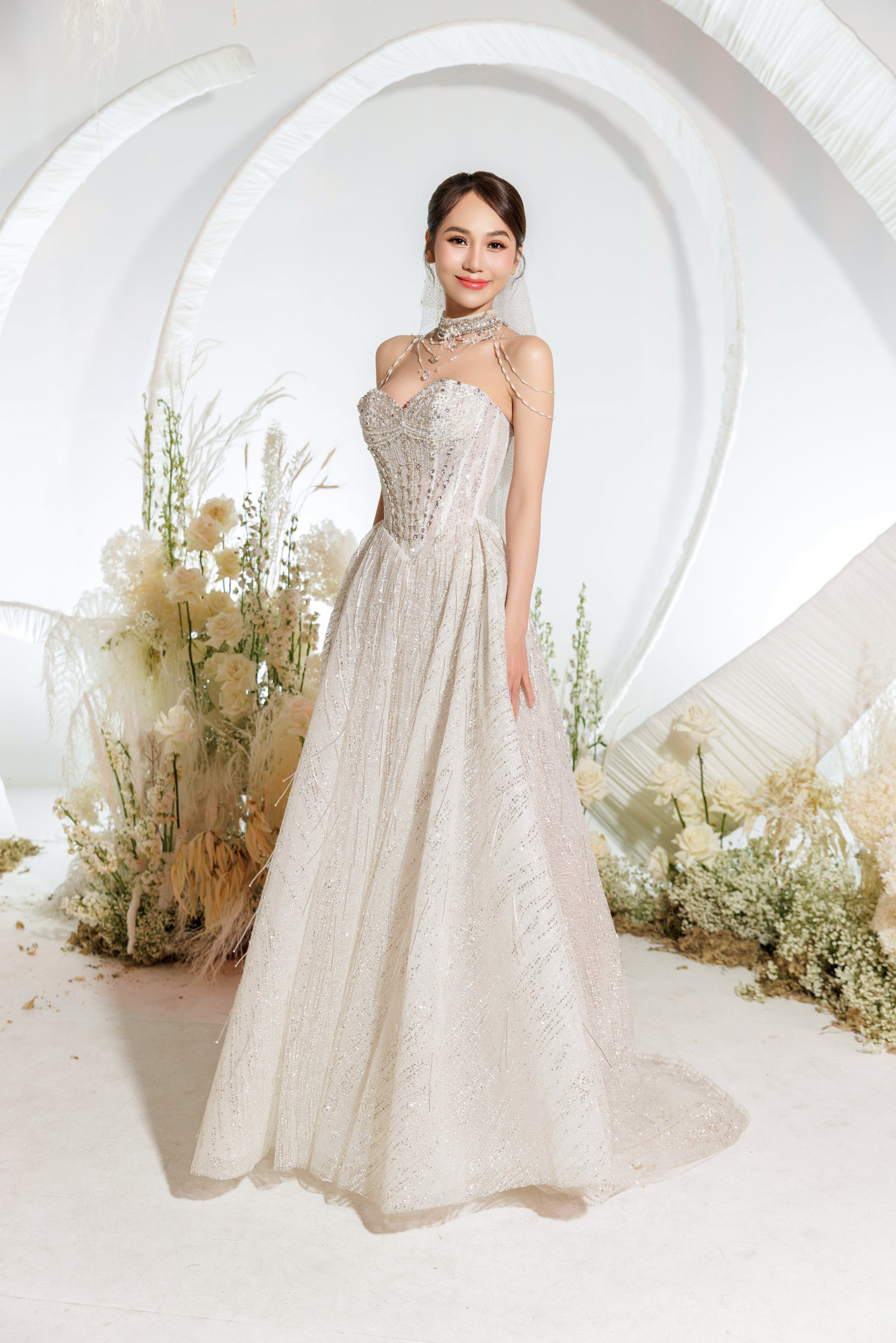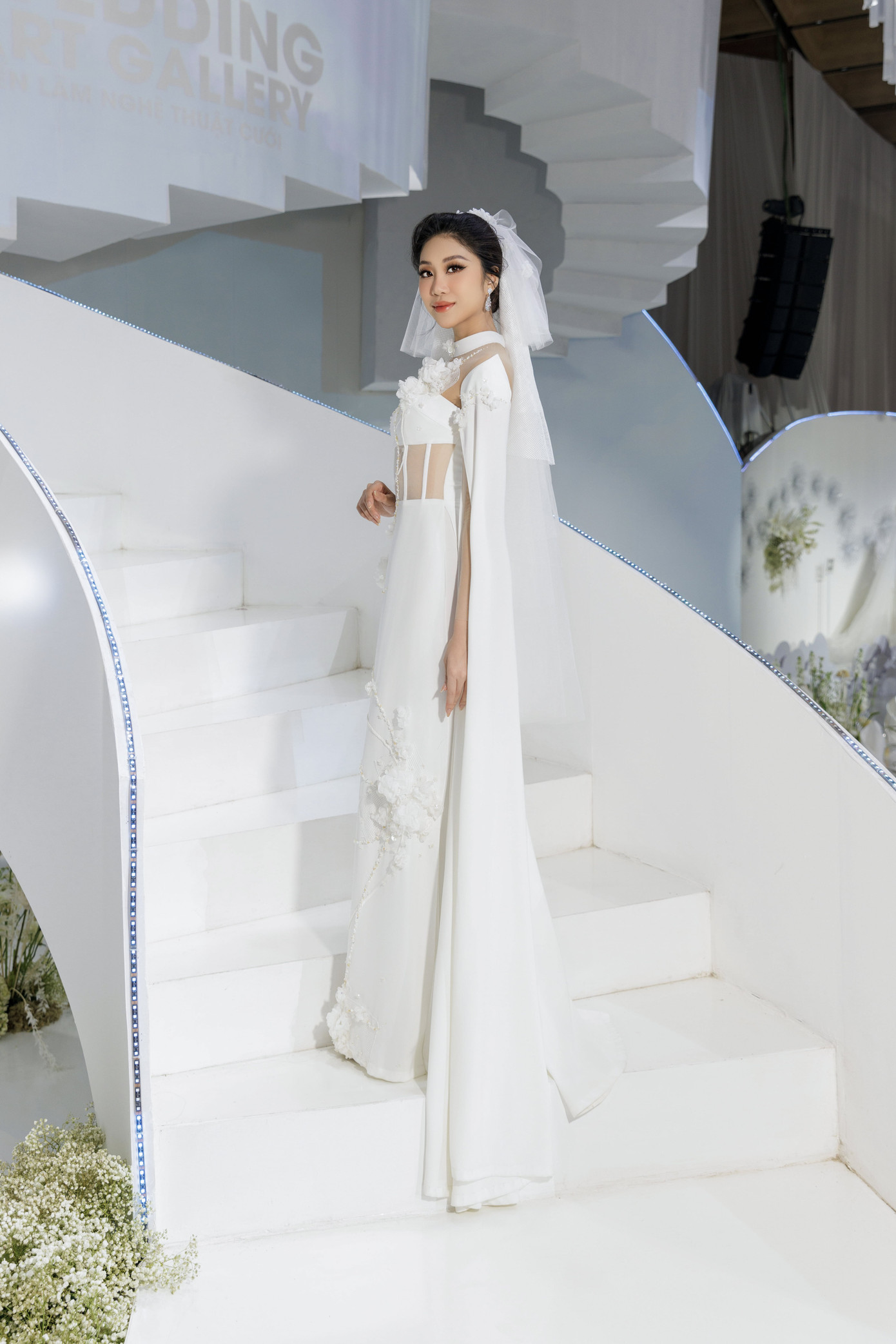 Hoa hậu Đỗ Lan Anh đảm nhận vai trò mở màn. Cô diện áo dài dáng corset, đính kết những bông hoa nổi bồng bềnh cùng những hạt pha lê lấp lánh. Mẫu thiết kế giúp khoe trọn đường cong, tôn lên nét quyến rũ của 'nàng Hậu' trên sàn catwalk.