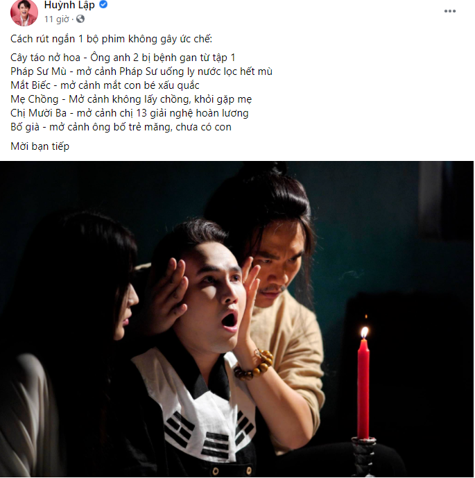 Cụ thể Huỳnh Lập viết: "Cách rút ngắn một bộ phim không gây ức chế: Cây Táo Nở Hoa - Ông anh 2 bị bệnh gan từ tập 1. Pháp Sư Mù - mở cảnh Pháp Sư uống ly nước lọc hết mù. Mắt Biếc - mở cảnh mắt con bé xấu quắc. Mẹ Chồng - Mở cảnh không lấy chồng, khỏi gặp mẹ. Chị Mười Ba - mở cảnh chị 13 giải nghệ hoàn lương. Bố Già - mở cảnh ông bố trẻ măng, chưa có con. Mời bạn tiếp".