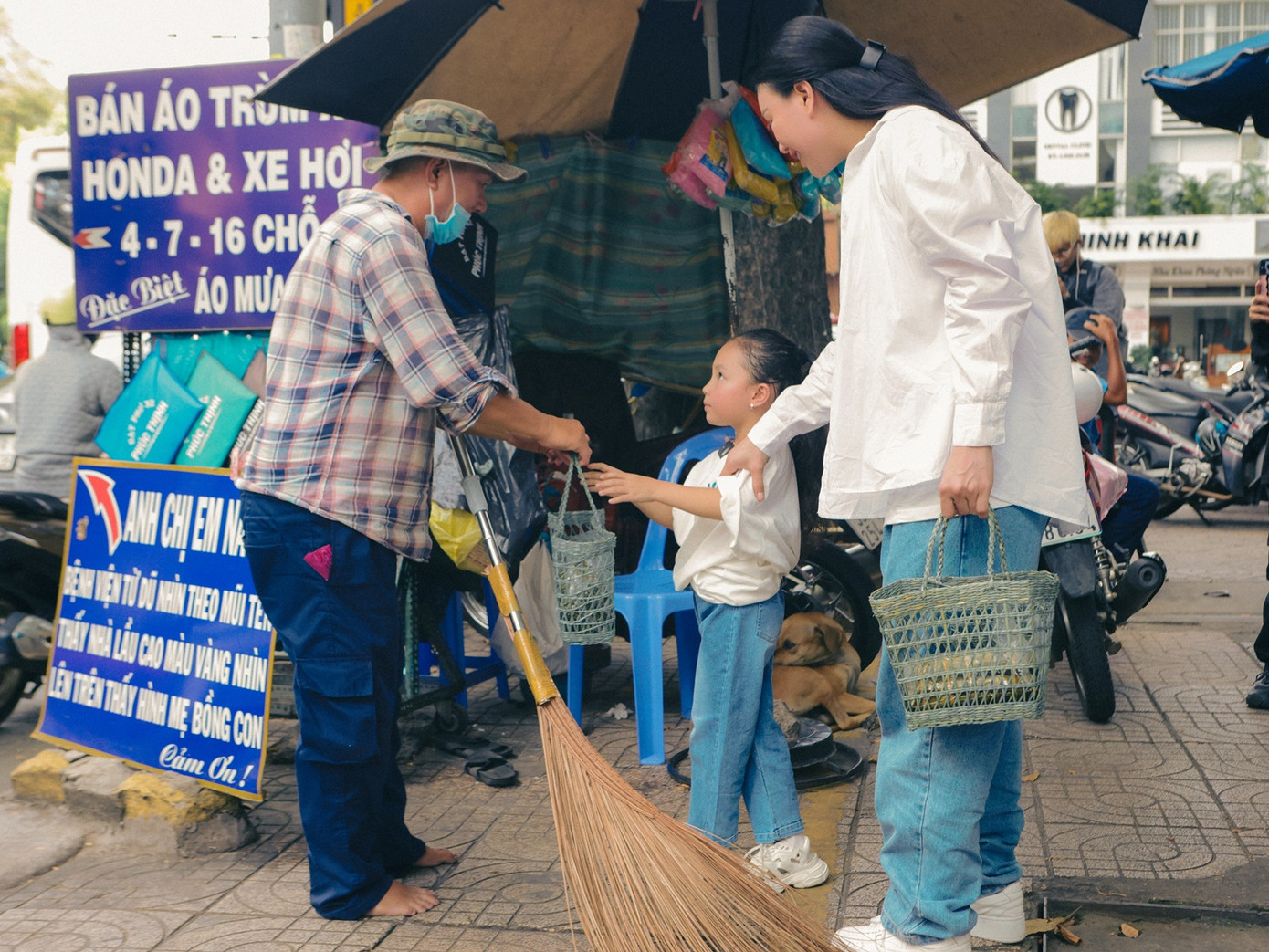 Bé Sophia xinh xắn, theo mẹ cả hành trình, luôn lễ phép và chủ động góp sức lực nhỏ bé của mình, phụ giúp mẹ chia sẻ những giỏ quà nho nhỏ đến các cô chú lao động nghèo, có hoàn cảnh khó khăn. “Tôi muốn con gái hiểu được ý nghĩa của việc cho đi và nhận lại”, Trà Ngọc Hằng cho biết lý do cùng con thực hiện hoạt động này.