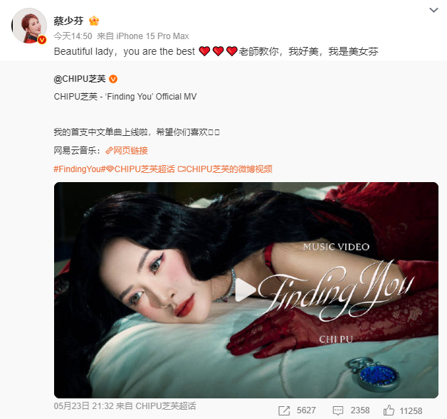 Trên Weibo, "nương nương" Thái Thiếu Phân chia sẻ bài đăng MV của Chi Pu với caption: "Quý cô xinh đẹp, em đỉnh nhất". Hai tỷ tỷ khác của Đạp Gió 2023 là Cung Lâm Na và Tăng Khả Ny cũng đăng bài ủng hộ Chi Pu.