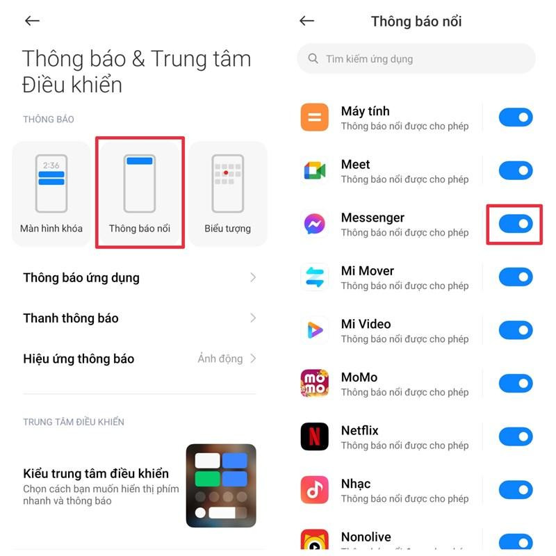 Đối với hệ điều hành Android, để bật tính năng này, bạn hãy vào Cài đặt > Thông báo và Trung tâm Điều khiển và bật tính năng Thông báo nổi > Chọn Messenger.