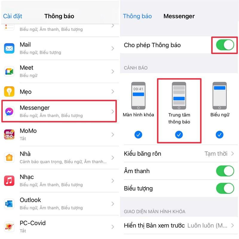 Đối với iOS để bật tính năng này, bạn hãy vào Cài đặt > thông báo > bật Cho phép Thông báo > Trung tâm thông báo.