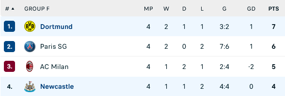 Bởi sau 4 lượt trận, Newcastle đã xuống đứng cuối bảng. Lúc này, 2 kẻ thất thế Dortmund và Milan đang vươn lên. Dortmund dẫn đầu với 7 điểm, tiếp theo là PSG (6), AC Milan (5), Newcastle (4).