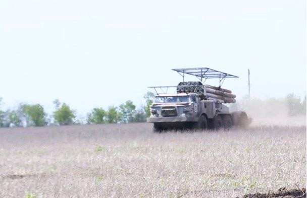 | BM-27 Uragan của Nga được trang bị giáp lồng chống máy bay không người lái. |