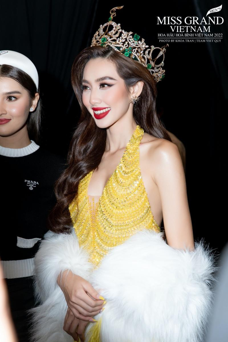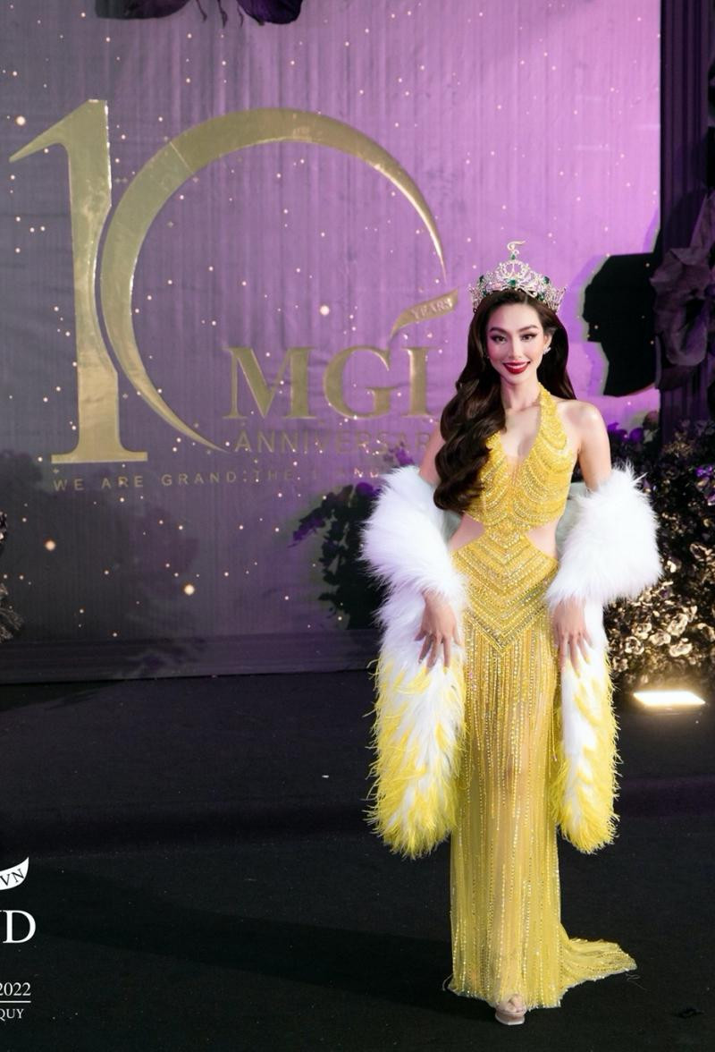 Trước giờ diễn ra đêm Chung kết Miss Grand International (Hoa hậu Hòa bình Quốc tế) 2022, Thùy Tiên xuất hiện tại black carpet (thảm đen) của sự kiện với một thiết kế màu vàng đính đá, cut-out theo đúng phong cách của nàng hậu.