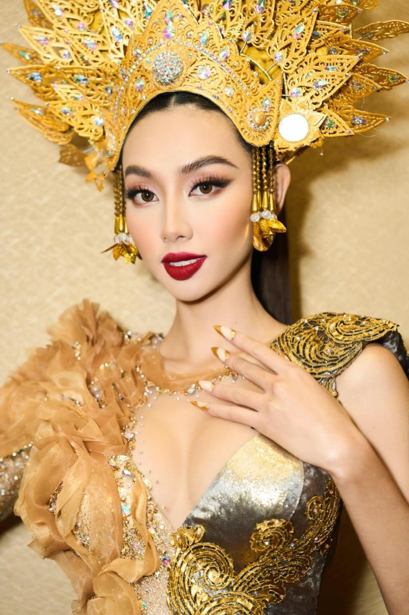 Trong tiết mục đồng diễn cùng dàn thí sinh của Miss Grand International năm nay, Hoa hậu Thùy Tiên diễn một thiết kế mang đậm nét văn hóa của Indonesia, do một nhà thiết kế của đất nước này tài trợ cho chương trình.