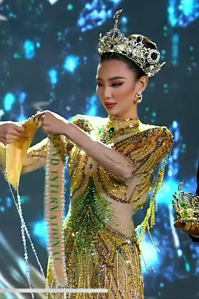 Ở khoảnh khắc trao sash và vương miện cho tân Hoa hậu Hòa bình Quốc tế, Thùy Tiên chọn bộ đầm Crown Dress II của NTK Nguyễn Minh Tuấn, lấy cảm hứng từ chính vương miện Hoa hậu Hòa bình Quốc tế phiên bản mới nhất.