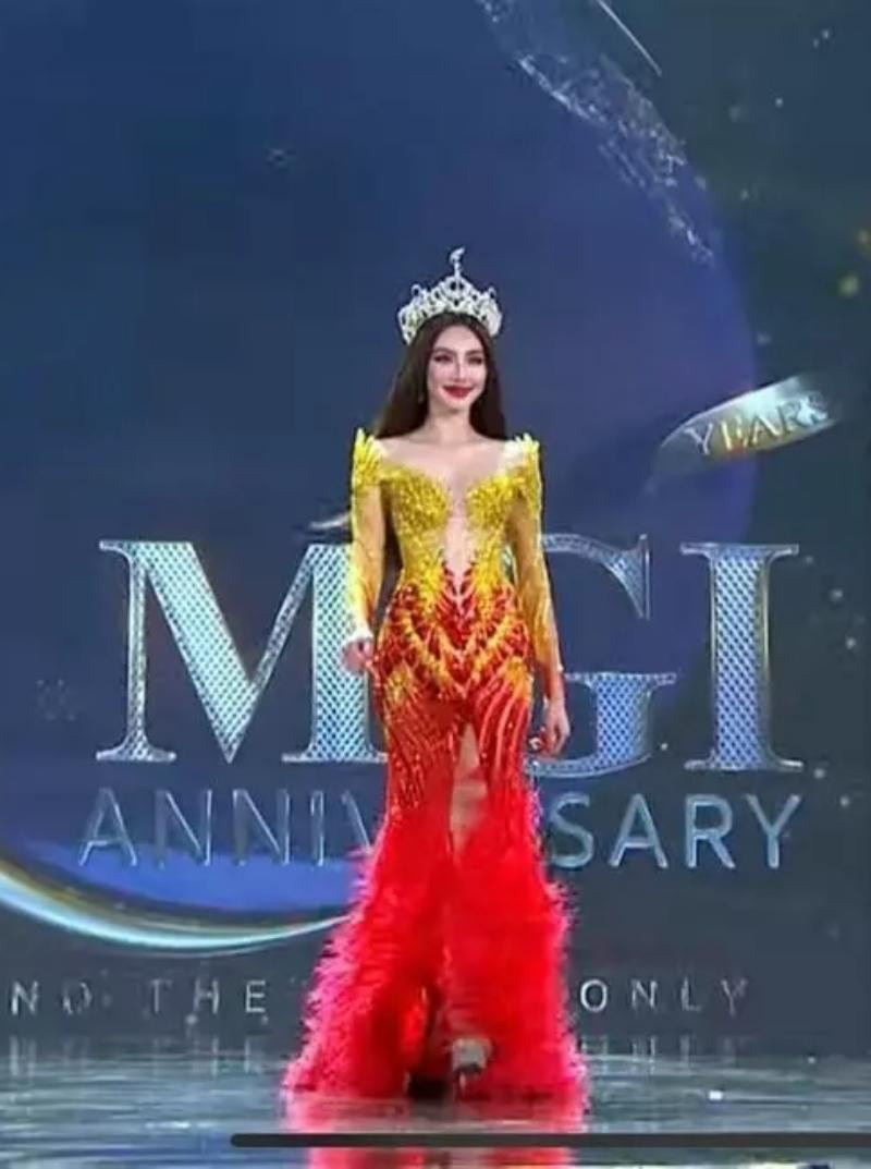 Trong phần hội ngộ các Miss Grand International tiền nhiệm, Hoa hậu Thùy Tiên diện một thiết của NTK Đỗ Long được lấy cả hứng từ màu cờ đỏ sao vàng của quốc kỳ Việt Nam.
