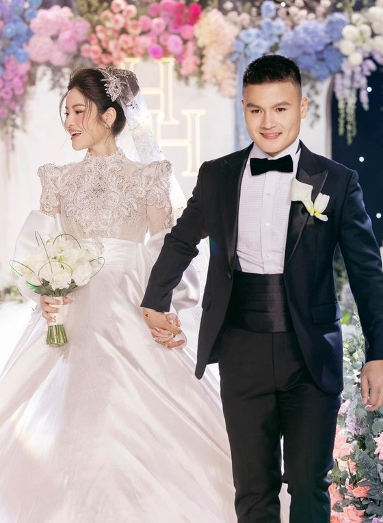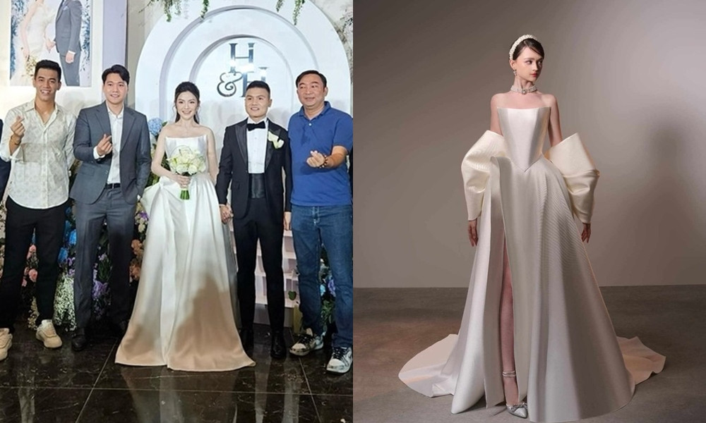Có một điều thú vị là phần eo váy được đính một đóa hoa lớn màu trắng, giống với bông hoa khổng lồ trong bó hoa cưới siêu độc đáo mà Chu Thanh Huyền cầm trên tay. Khán giả cũng khen cô dâu vẫn có vóc dáng gọn gàng dù đang mang thai con đầu lòng.