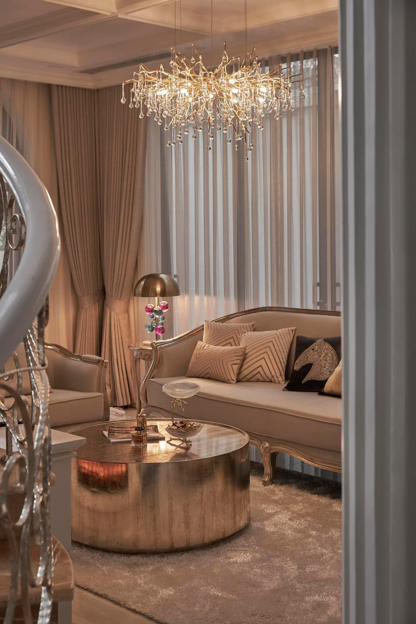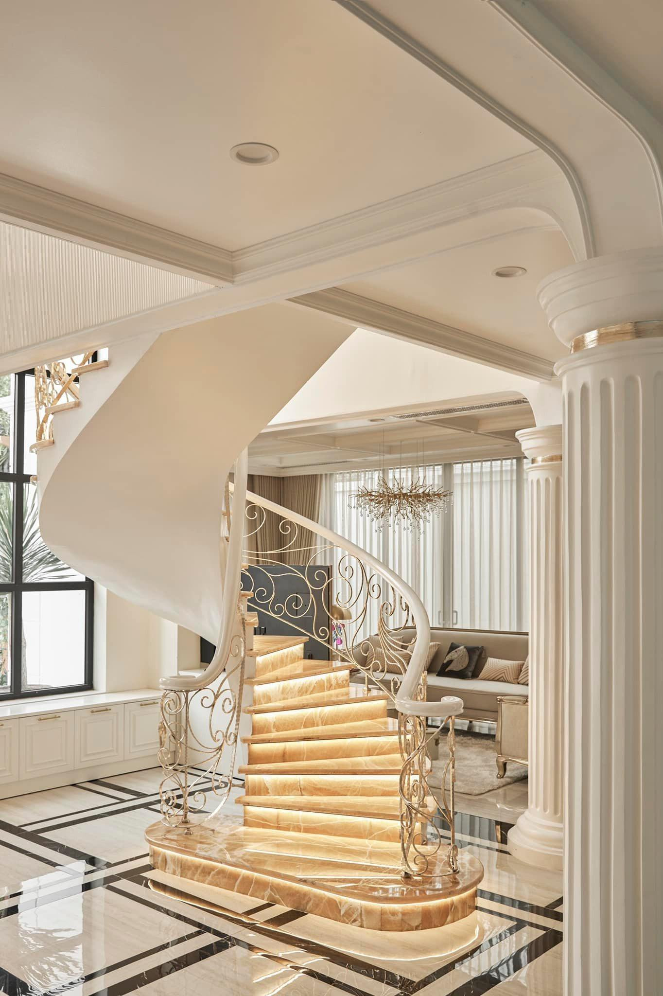 Nội thất trong nhà được nữ ca sĩ bày trí xa hoa, sang trọng. Từng không gian sống được cô chăm chút tỉ mỉ. Điểm nhấn ở phòng khách chính là chiếc cầu thang dát vàng óng ánh. Khoảng sân trước nhà, Lệ Quyên thiết kế khu vườn nhỏ, nơi cô có thể thư giãn, tận hưởng cuộc sống bình yên.