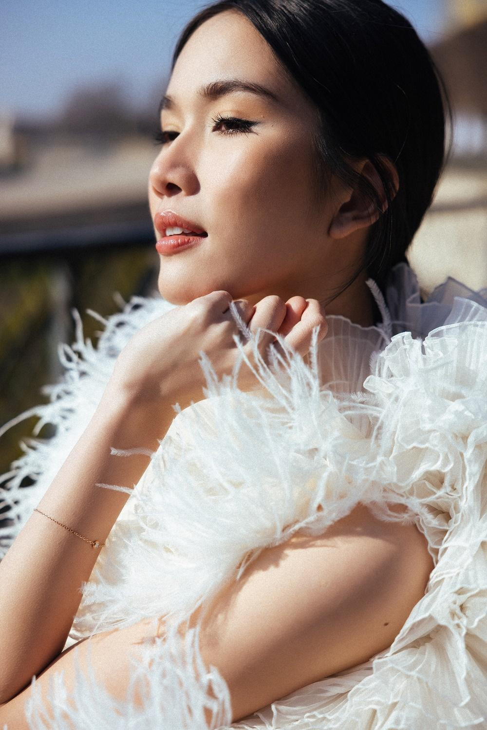 22-68 là thiết kế màu trắng duy nhất nằm trong bộ sưu tập, mang đến cho người mặc diện mạo độc đáo, khác biệt. Với sự kết hợp tài tình giữa vải tuyn và lông vũ, thiết kế tạo điểm nhấn điệu đà, nữ tính với phần nơ cổ ngọt ngào, duyên dáng.