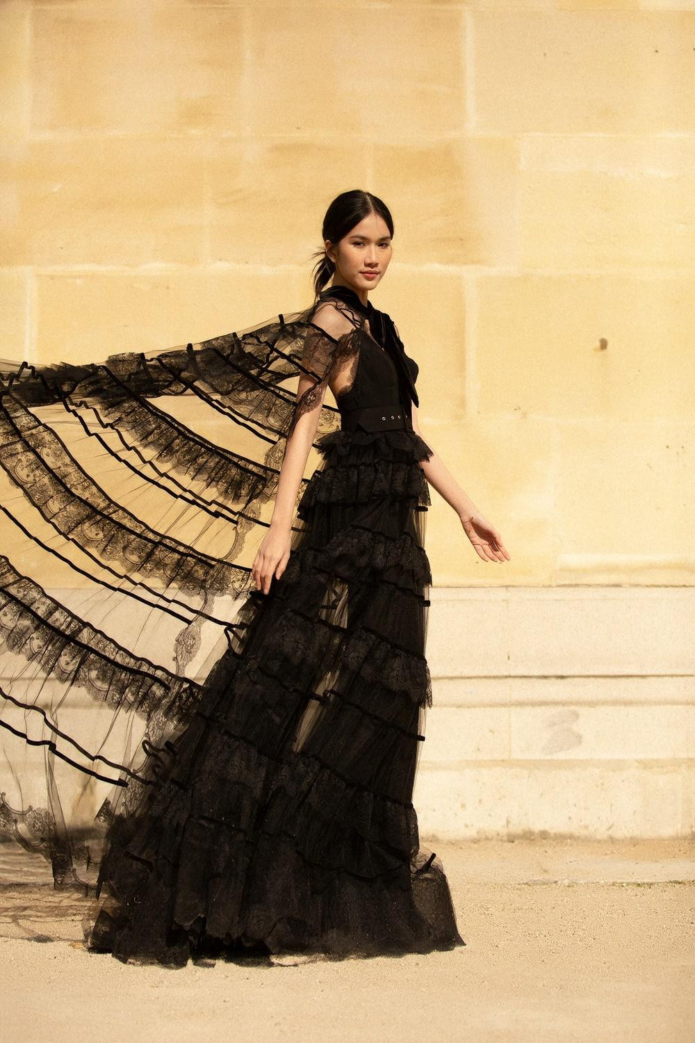 Thiết kế 22-93 được thực hiện chủ yếu từ chất liệu ren thêu, kết hợp với họa tiết hoa được thêu chỉ vàng quý phái. Chi tiết khoét eo quyến rũ, tương phản với phần cổ cao kín đáo, tạo hiệu ứng thị giác ấn tượng cùng phần vai bồng đầy phá cách, cá tính.