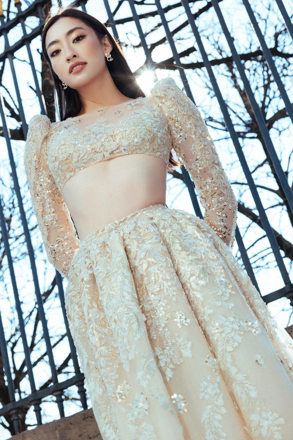 22-79 là thiết kế bao gồm phần áo ngắn ôm gọn lấy cơ thể người mặc và chân váy chữ A. Bộ trang phục quyến rũ được làm bằng vải tuyn vàng champagne, kết cườm, thêu đính tỉ mỉ, tạo hiệu ứng xuyên thấu với chất liệu tulle cao cấp, mang đến cho nàng hậu Gen Z diện mạo trẻ trung, năng động.