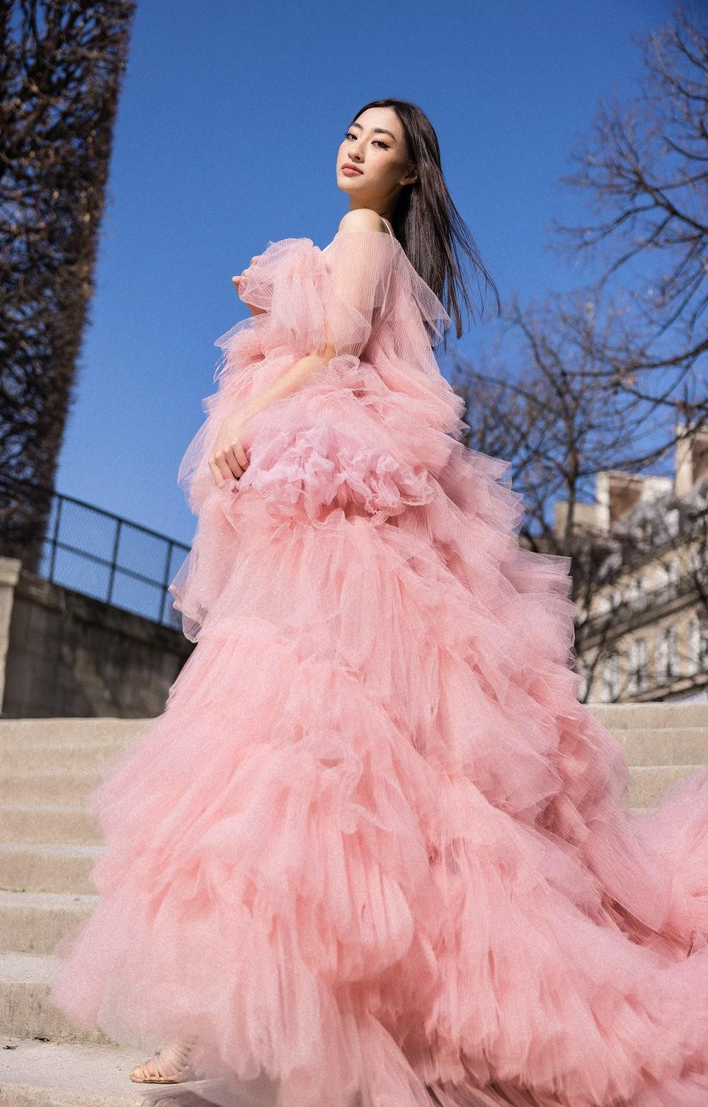 Được làm bằng vải tuyn màu hồng phấn, thiết kế này là một trong những thiết kế ấn tượng nhất trong bộ sưu tập. Chiếc váy ngắn ở phía trước tương phản với phần đuôi dài ở phía sau, cùng chi tiết hoa trung tâm và vạt áo ren kiểu Pháp với đường viền sa tanh.
