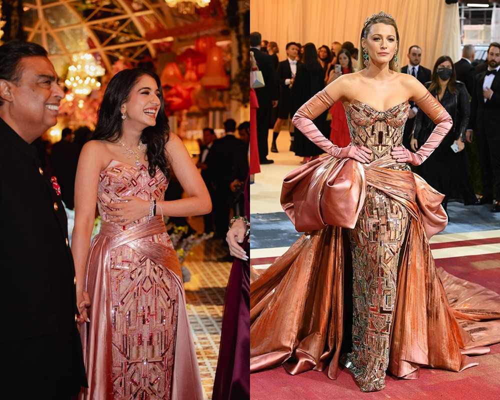 Cô dâu mới Radhika Merchant tất nhiên luôn là tâm điểm của mọi sự chú ý và mỗi lần xuất hiện, nàng dâu 29 tuổi đều đẹp lộng lẫy trong những bộ đầm đắt giá được thiết kế riêng cho mình. Chẳng hạn như bộ đầm này của Versace, đã được chỉnh sửa lại theo sở thích của Radhika Merchant nên có màu sắc khác biệt so với mẫu gốc mà Blake Lively từng mặc dự Met Gala 2022.