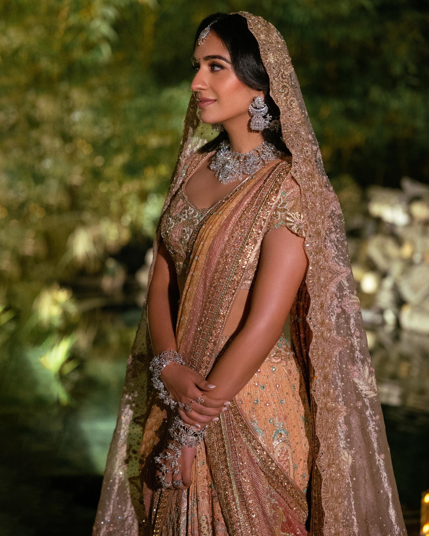 Radhika Merchant mặc rất nhiều trang phục truyền thống của phụ nữ Ấn Độ và bộ sau luôn cầu kỳ, lộng lẫy hơn bộ trước. Như bộ váy này đính vàng, bạc, kim cương cùng pha lê khiến cô dâu như tỏa sáng trong từng bước đi.