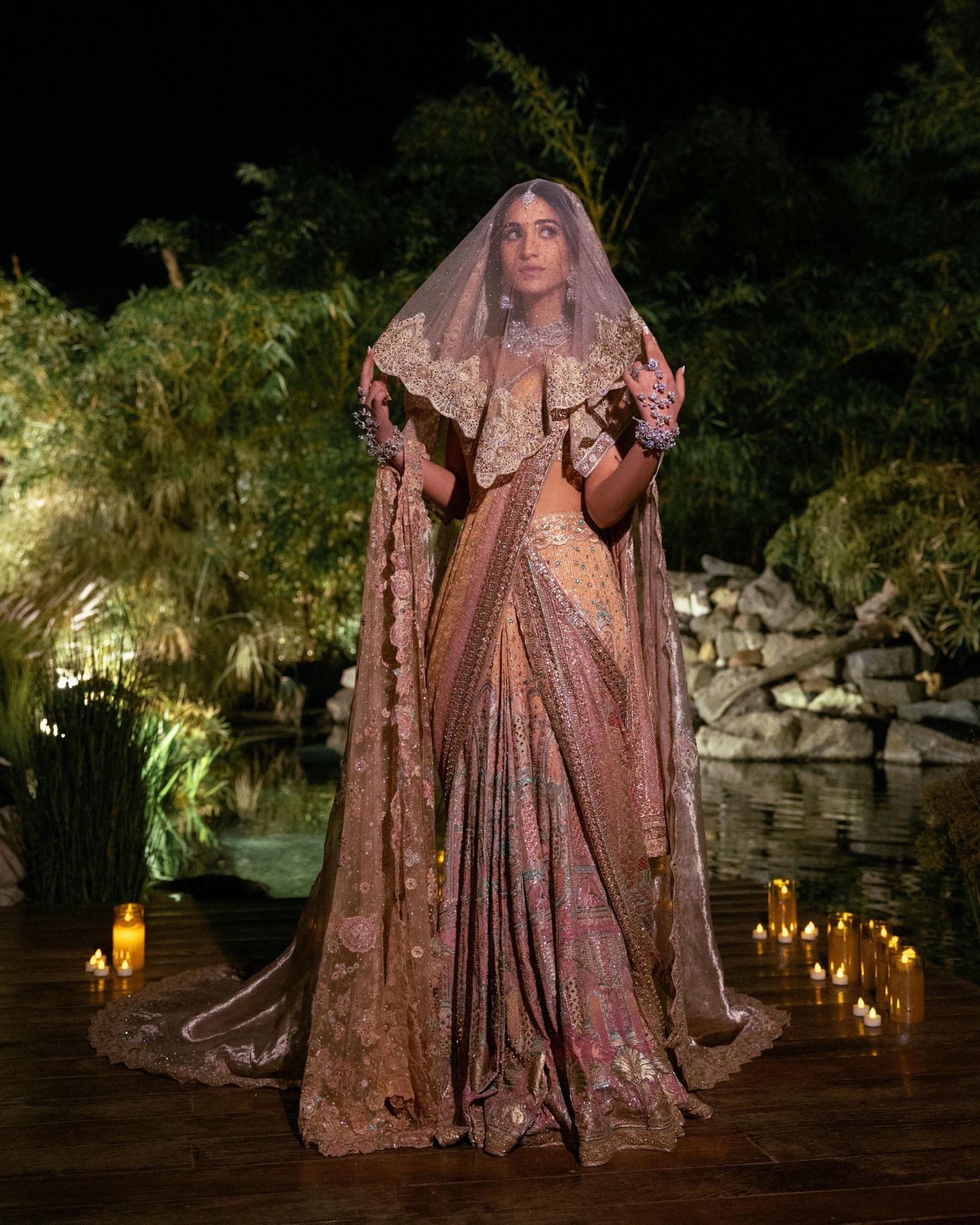 Nhưng “trùm cuối” của chuỗi tiệc mừng đám cưới này là bộ saree vừa truyền thống vừa hiện đại. Bộ váy cưới sử dụng vải dệt theo kỹ thuật cổ truyền của người Ấn, khăn choàng cũng được vẽ tay kết hợp với những chi tiết đính kết tinh xảo.