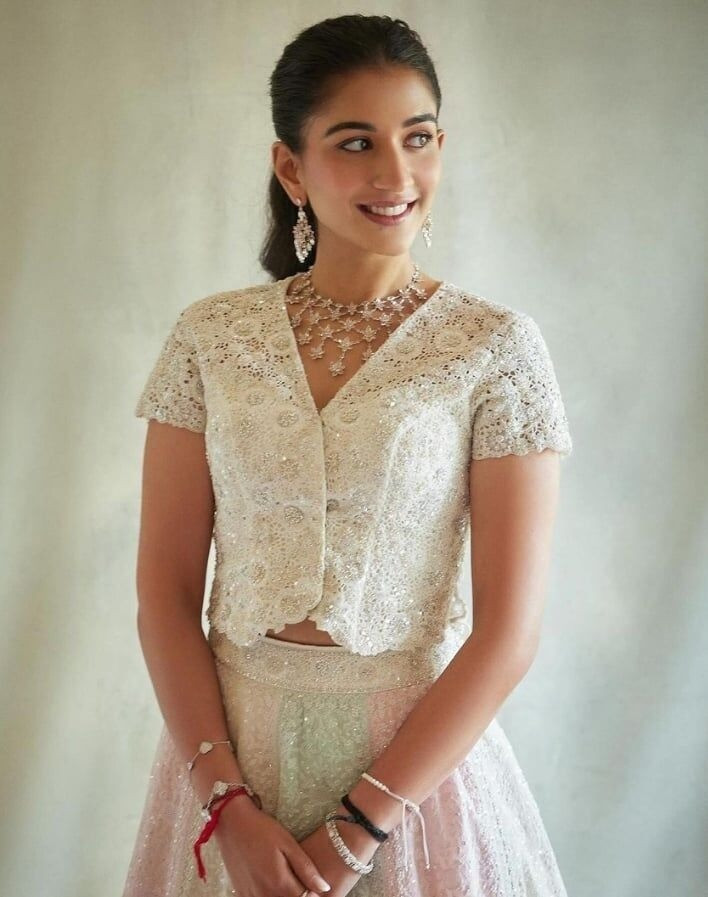 Một bộ đồ cưới truyền thống khác được Radhika Merchant lựa chọn đến từ một nhãn hiệu thời trang cao cấp của Ấn Độ. Bộ váy được đính rất nhiều ngọc trai, pha lê trên chất liệu vải ren giúp cô dâu nhìn đầy dịu dàng nữ tính.