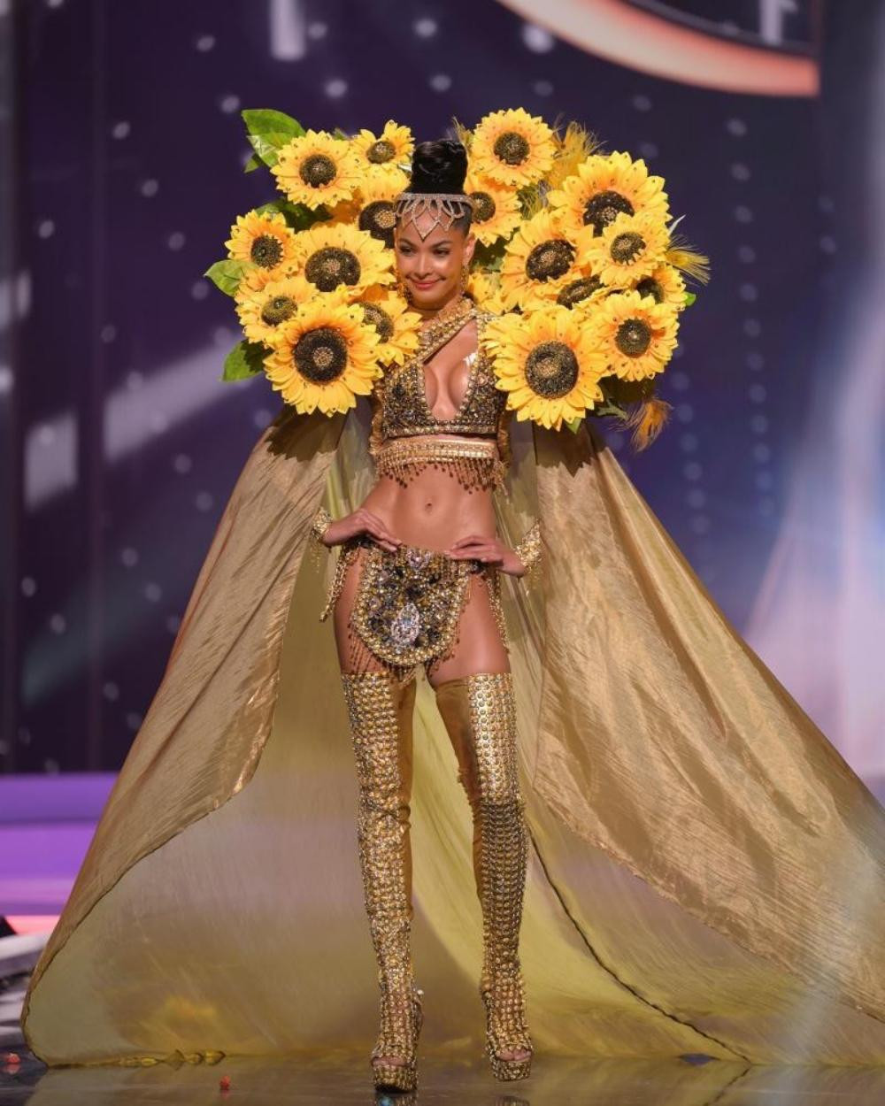 Hoa hậu Dominic Kimberly Jimenez với bộ trang phục lấy cảm hứng từ hoa hướng dương. Đây là loài hoa yêu thích của người dân Dominic, được trồng rất nhiều ở miền Trung nước này.