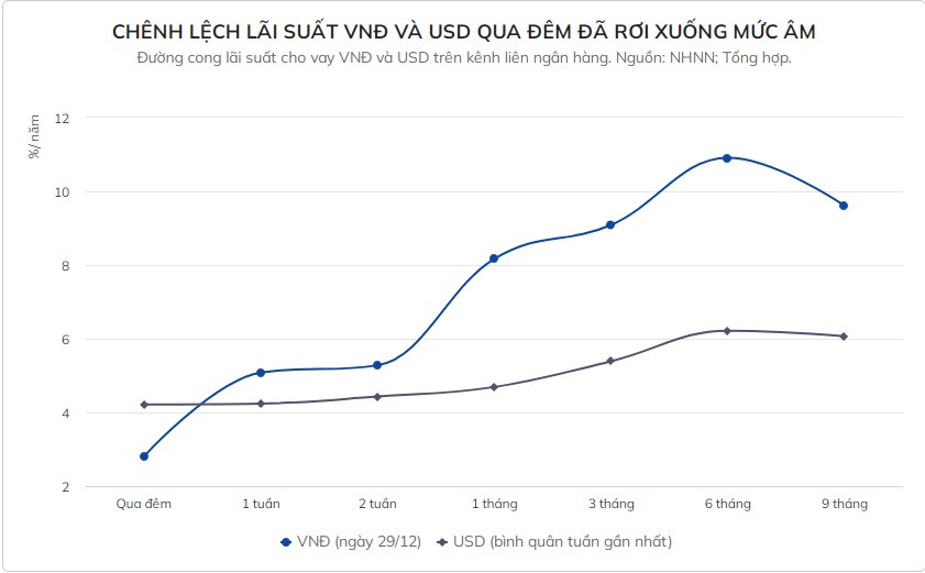 Tuy nhiên, trong khoảng hai tuần gần đây, lãi suất cho vay VNĐ liên ngân hàng kỳ hạn qua đêm liên tục lao dốc, hiện đã mất mốc 3%/năm (ngày 29/12). Trong khi đó, lãi suất cho vay cùng kỳ hạn với đồng USD theo NHNN vẫn duy trì ở mức trên 4%/năm. Như vậy, chênh lệch lãi suất giữa VNĐ và USD liên ngân hàng một lần nữa rơi xuống mức âm. Điều này có thể khiến nhu cầu nắm giữ USD của các ngân hàng tăng lên, khi việc cho vay USD trên thị trường này mang lại lợi suất cao hơn cho vay VNĐ.