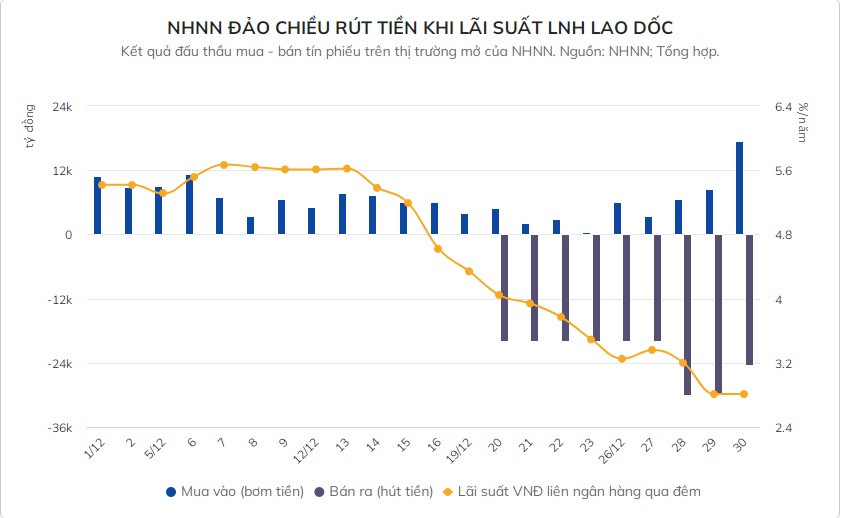 Đáng chú ý, trong cả tuần cuối năm này, dù nhà điều hành vẫn duy trì các giao dịch mua giấy tờ có giá kỳ hạn 7 ngày với giá trị hàng nghìn tỷ đồng/phiên, xu hướng chung của NHNN vẫn là rút ròng khối lượng tiền Đồng khỏi hệ thống.