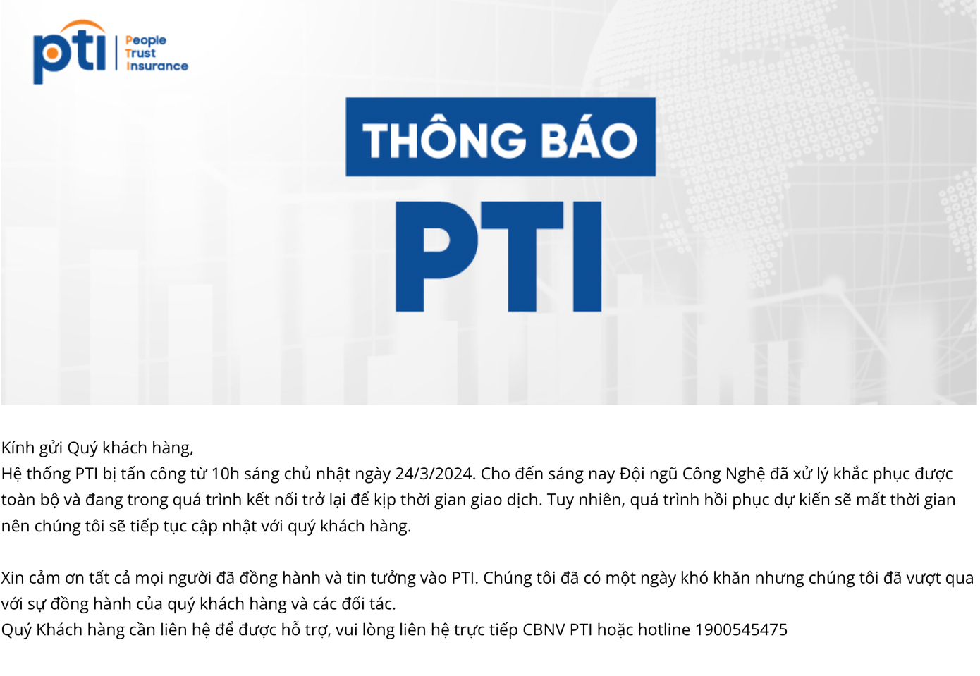 Ngoài hệ thống VNDirect gặp sự cố, website của CTCP Bảo hiểm Bưu điện (mã PTI) cũng bị đánh “sập”. Tương tự bên VNDirect, PTI cũng là doanh nghiệp liên quan doanh nhân Phạm Minh Hương. Bà Phạm Minh Hương hiện đồng thời là Chủ tịch Hội đồng quản trị của VNDirect và PTI. Website PTI thông báo hệ thống cũng bị tấn công từ 10h sáng chủ nhật, ngày 24/3.