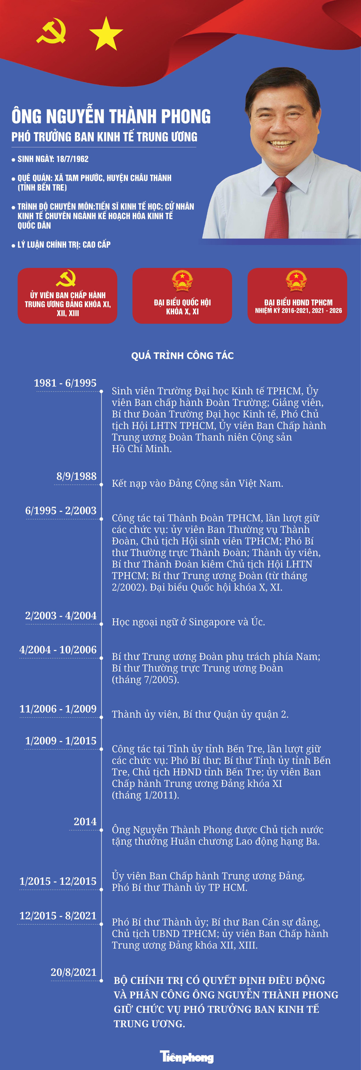 Theo Quyết định của Bộ Chính trị, ông Nguyễn Thành Phong thôi tham gia Ban Chấp hành, Ban Thường vụ và thôi giữ chức Phó Bí thư Thành ủy nhiệm kỳ 2020 – 2025, Chủ tịch UBND TPHCM nhiệm kỳ 2021 – 2026.