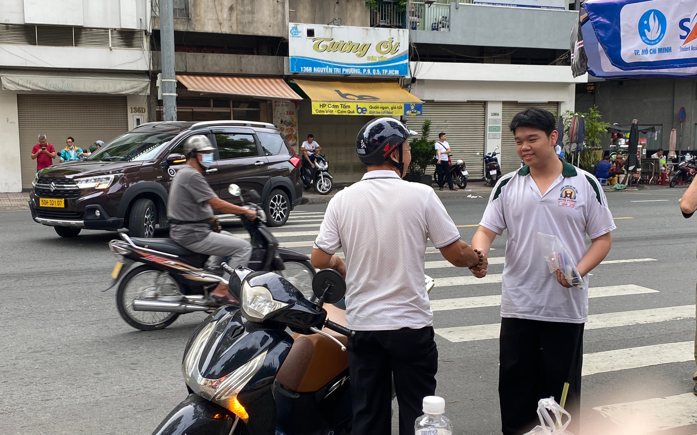 Tại điểm trường THPT Lương Thế Vinh (Quận 1), phụ huynh của bạn Đức Minh, học sinh trường THPT Lương Thế Vinh, chia sẻ vì bạn là con thứ út trong gia đình nên chú cũng cảm thấy thoải mái khi bạn đi thi. Ngoài ra, chú cũng không quên chúc con làm bài thi suôn sẻ.