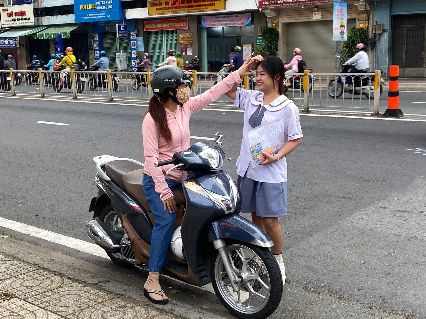 Ngoài những lời động viên, nhiều phụ huynh cũng không quên thể hiện những hành động dịu dàng như cái ôm, cái nắm tay, cái xoa đầu để trấn an tinh thần các con.