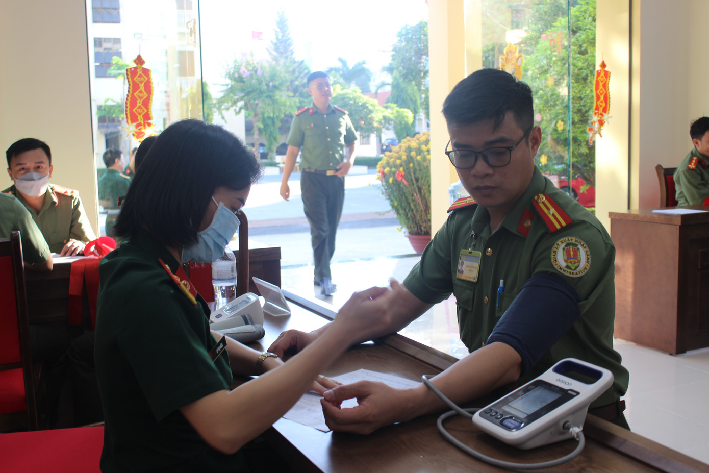 | Các chiến sĩ khám sàng lọc y tế trước khi hiến máu. |