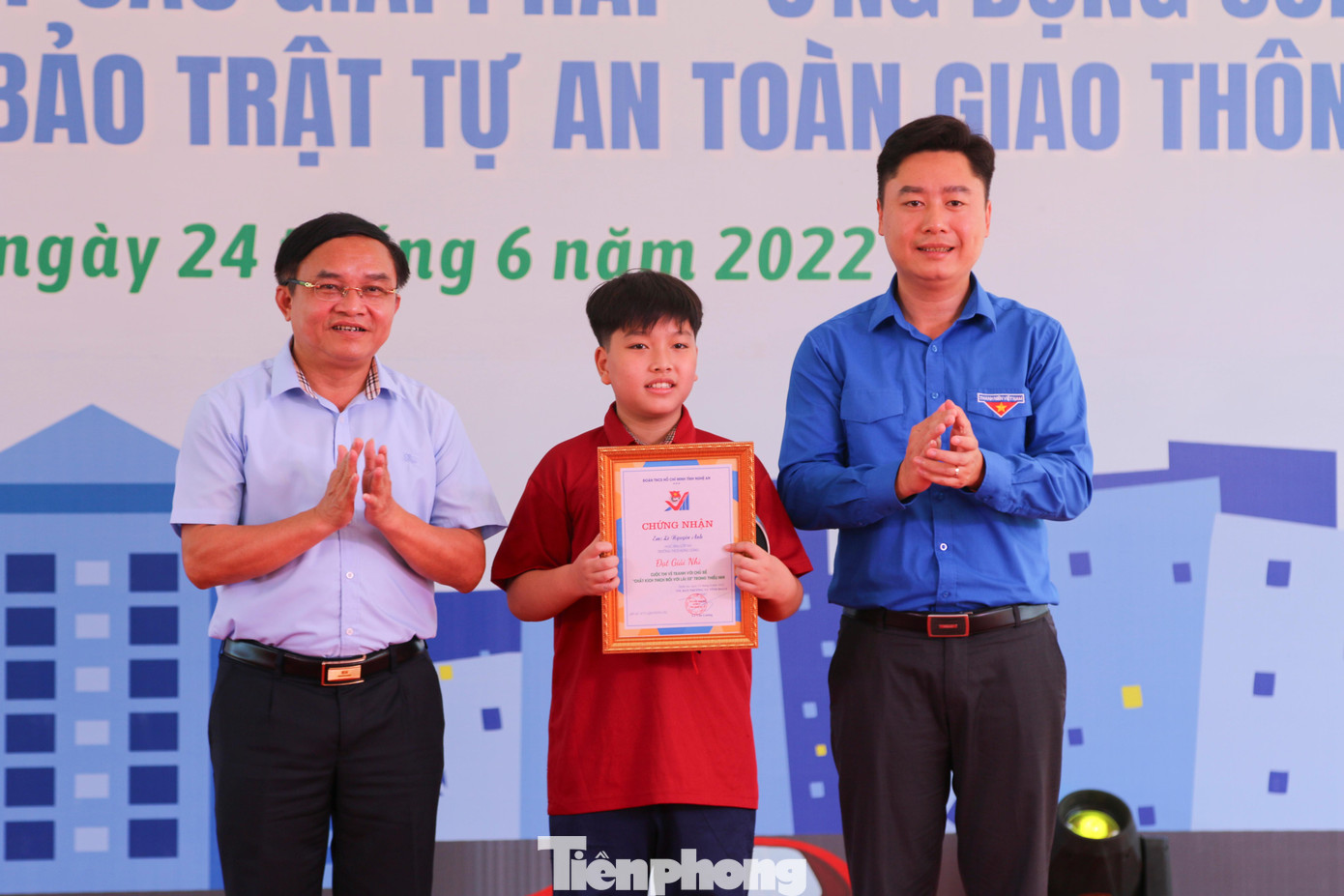 Năm 2022, T.Ư Đoàn TNCS Hồ Chí Minh, T.Ư Hội LHTN Việt Nam phối hợp Ủy ban ATGT Quốc gia phát động Cuộc thi đề xuất các giải pháp “Ứng dụng công nghệ trong công tác đảm bảo trật tự an toàn giao thông”, nhằm phát huy vai trò xung kích, tình nguyện, sáng tạo của đoàn viên thanh niên triển khai chương trình Chuyển đổi số quốc gia đến năm 2025, định hướng đến năm 2030 của Chính phủ; nâng cao nhận thức và năng lực của thanh thiếu nhi trong sử dụng các nền tảng số, ứng dụng số để phục vụ cuộc sống, phục vụ công tác đảm bảo trật tự an toàn giao thông và chống ùn tắc giao thông. Trong ảnh: Anh Nguyễn Hải Minh và Phó Bí thư Thường trực Tỉnh ủy Nghệ An Nguyễn Văn Thông cùng các đại biểu trao mũ bảo hiểm cho đoàn viên, thanh niên, học sinh, sinh viên tỉnh Nghệ An. |