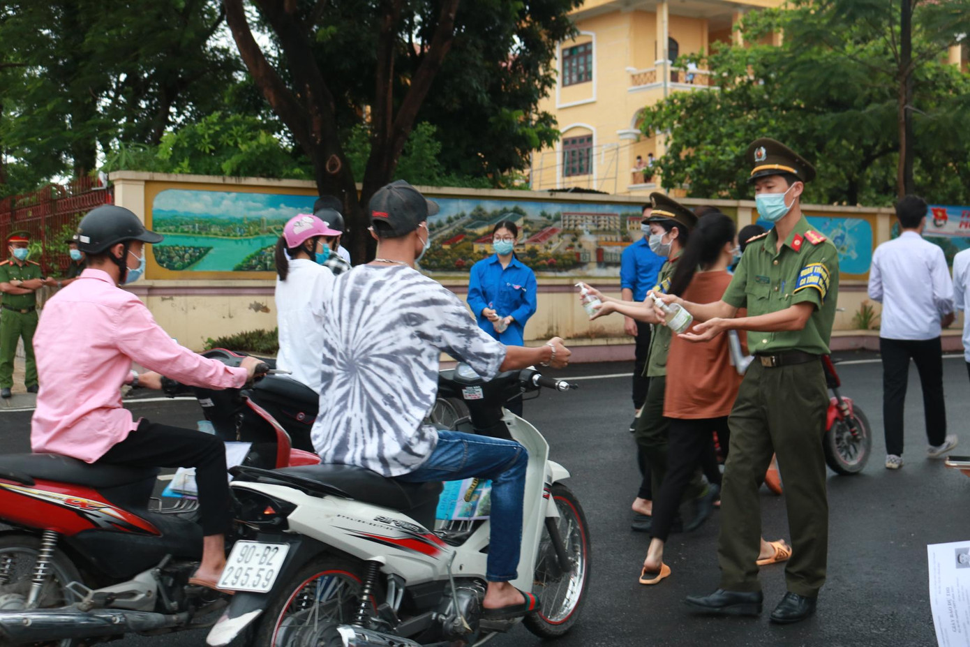 | Thí sinh trước khi vào khu vực thi đều được sát khuẩn tay, bảo đảm công tác phòng chống dịch. |