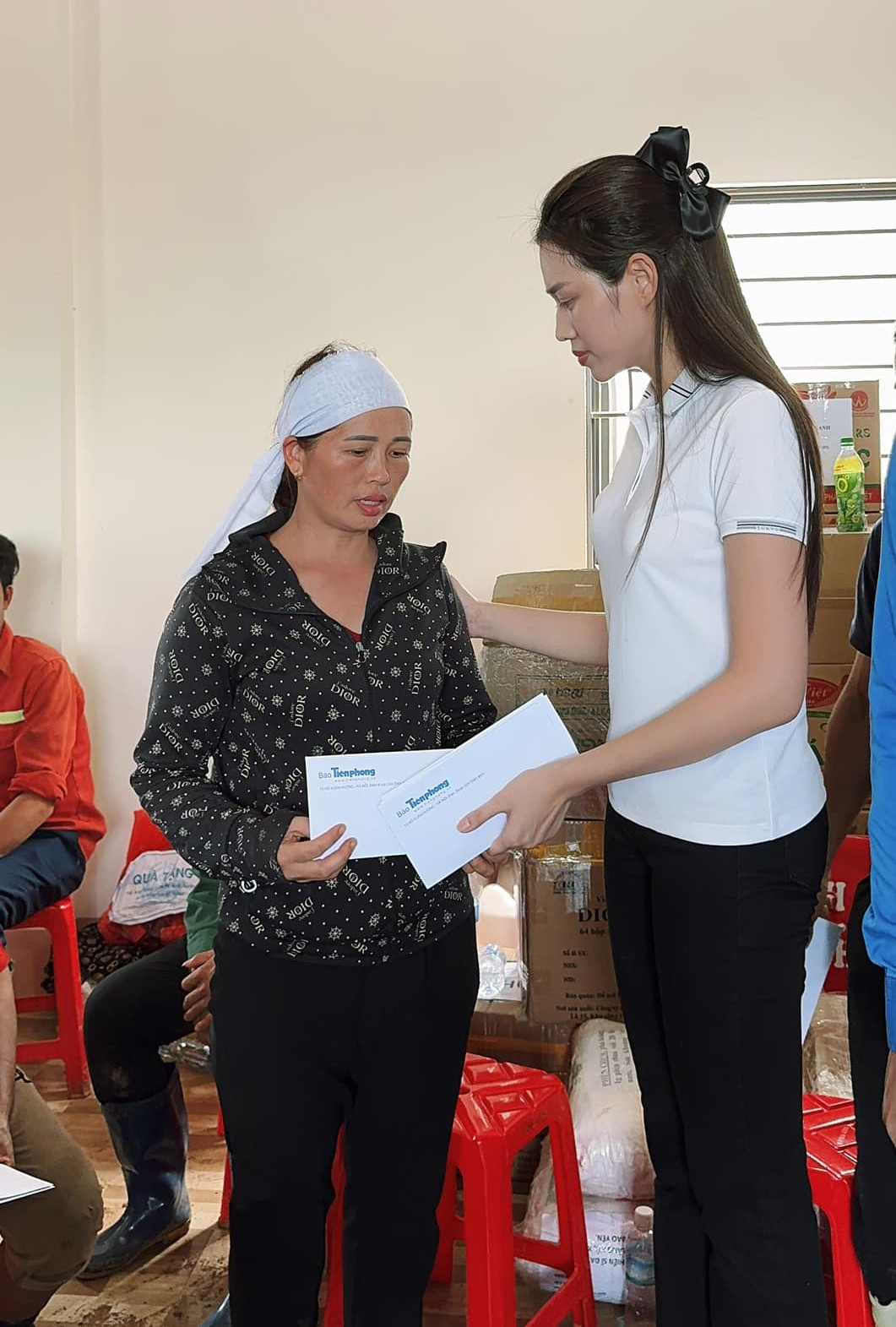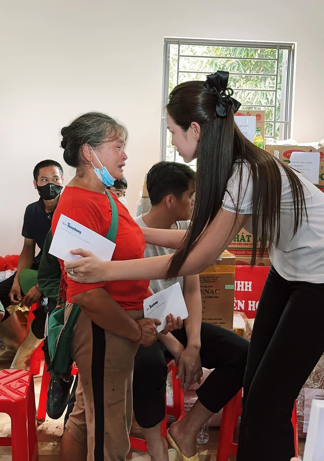 Nàng hậu chỉ biết dành cái ôm an ủi tới bà Vàng Thị Sời. Con dâu cùng ba cháu nội của bà đã không thoát được trận lũ quét kinh hoàng, con trai đang nằm viện và có nguy cơ bị liệt. Bà Sời thoát chết do vắng nhà ngày hôm đó, nhưng bây giờ không biết phải sống sao khi mất đi 4 người thân yêu.