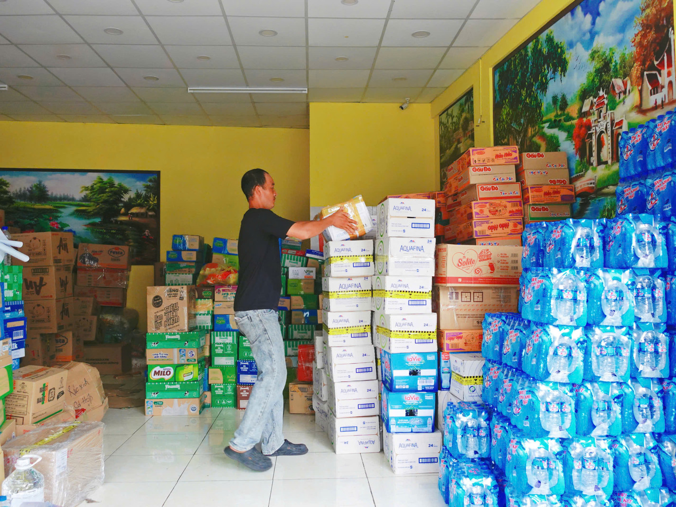 Không chỉ mì tôm, nước sạch mà còn có các loại bánh kẹo, xúc xích và đồ hộp bảo quản trong thời dài, tất cả đều được đóng gói kỹ lưỡng để an toàn chuyển đến tay người dân.