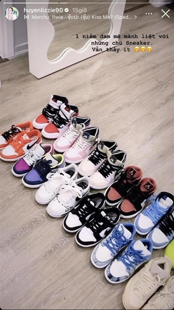 Chính vì thế mà netizen cũng cho rằng phong cách yêu thích của Huyền Lizzie là trang phục nữ tính ngọt ngào, và bộ sưu tập giày của cô hẳn toàn những đôi cao gót với kiểu dáng mảnh mai, có chi tiết trang trí điệu đà. Thế nhưng, đam mê của Huyền Lizzie lại là hơn chục đôi giày thể thao, nhìn thì nhiều mà nữ diễn viên lại than “vẫn thấy ít”.