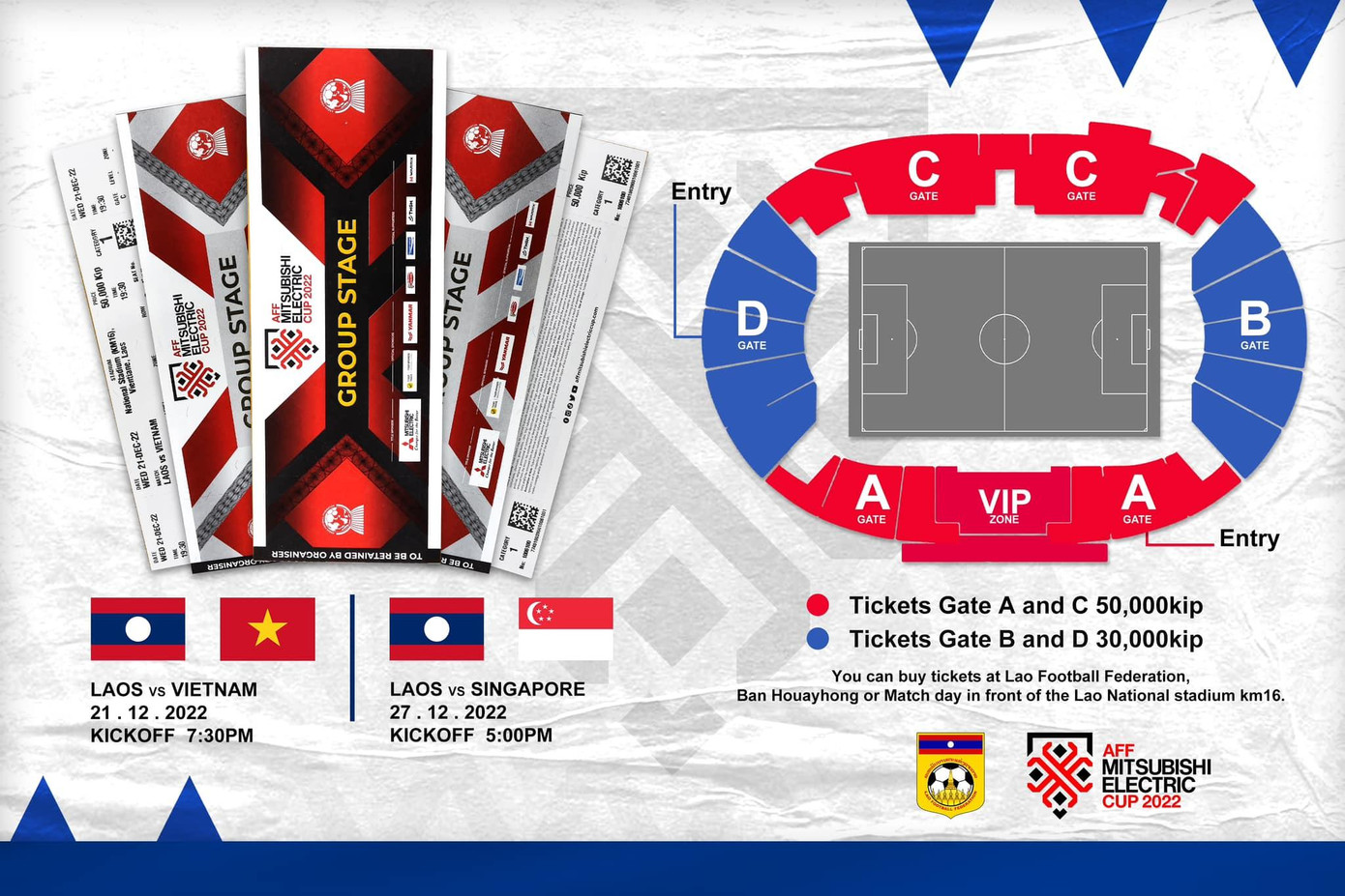 Cụ thể theo thông báo của BTC nước chủ nhà, vé xem trận đấu giữa đội tuyển Lào và Việt Nam (ngày 21/12) và Lào-Singapore (ngày 27/12) có cùng 2 mệnh giá. Giá vé khán đài A và C là 50.000 Kip (tương đương khoảng 68.000 đồng) và 30.000 Kip với các vị trí khán đài B, D (khoảng 40.000 đồng).