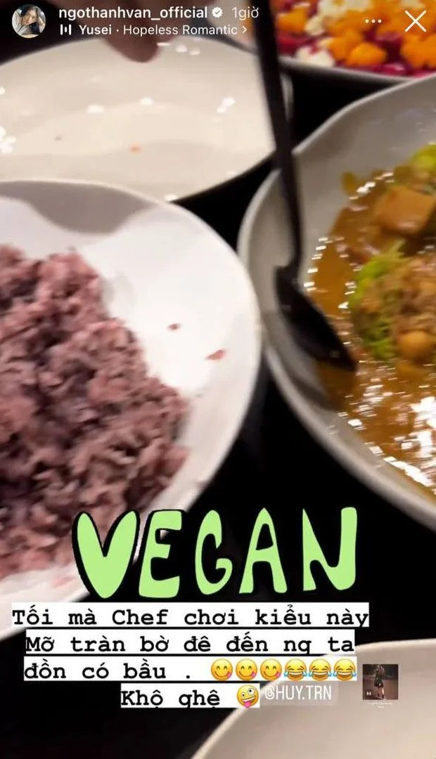 Đã vậy, Huy Trần còn từng trách yêu Ngô Thanh Vân rằng cô không chịu học nấu ăn thì sau này ai nấu cho con, làm mọi người càng tin chắc rằng nếu chưa có gì thì sao Huy Trần lại nhắc tới chuyện con cái. Tuy nhiên, không để mọi người thắc mắc lâu hơn, Ngô Thanh Vân đã tâm sự trên trang cá nhân rằng Huy Trần cứ nấu ăn ban tối khiến “mỡ tràn bờ đê” nên người ta đồn cô có bầu.