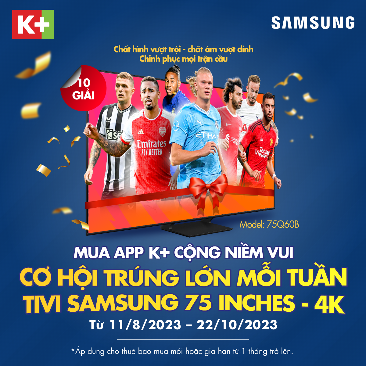 Bên cạnh đó, K+ còn mang tới cho khách hàng thuê bao K+ App chương trình rút thăm may mắn với quà tặng “khủng” từ Samsung: Liên tục trong vòng 10 tuần từ 11/8 - 22/10/2023, khách hàng mua mới hoặc gia hạn thuê bao K+ App có cơ hội trúng thưởng mỗi tuần 1 TV Samsung 75 inches - 4K và nhiều giải thưởng hấp dẫn khác trong chương trình “Quay số may mắn tri ân khách hàng năm 2023”.