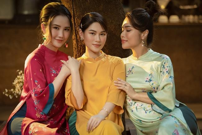 Primmy Trương lựa chọn cho mình chiếc áo dài màu đỏ hồng với họa tiết cầu kỳ làm nổi bật khí chất con dâu nhà hào môn. Còn nữ diễn viên Ngọc Thanh Tâm lại trái ngược hoàn toàn khi chọn áo dài vàng đơn giản.