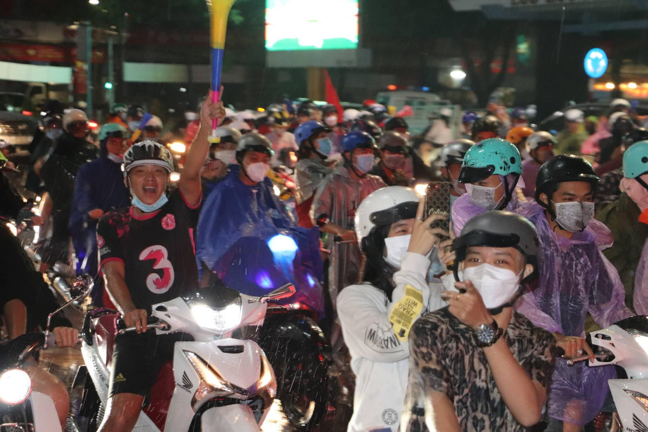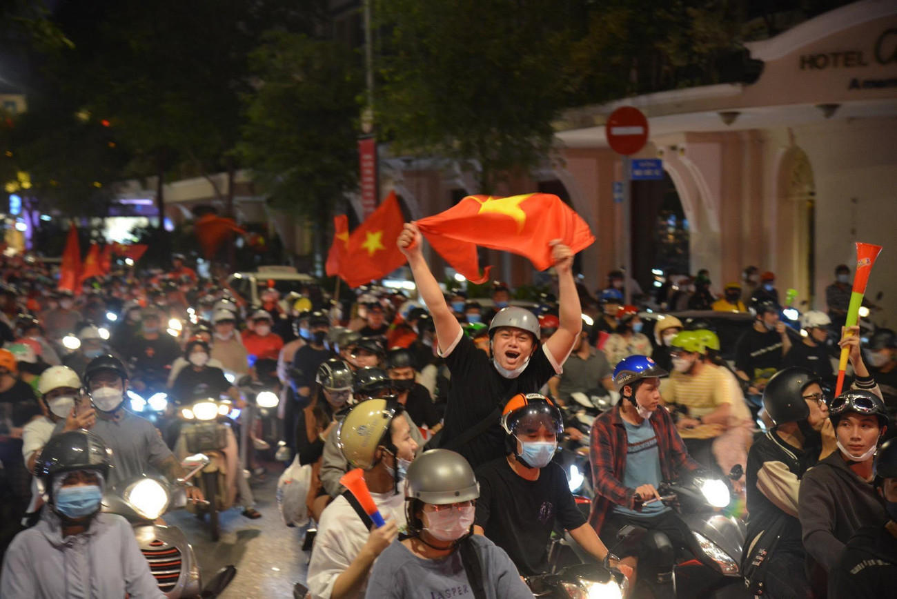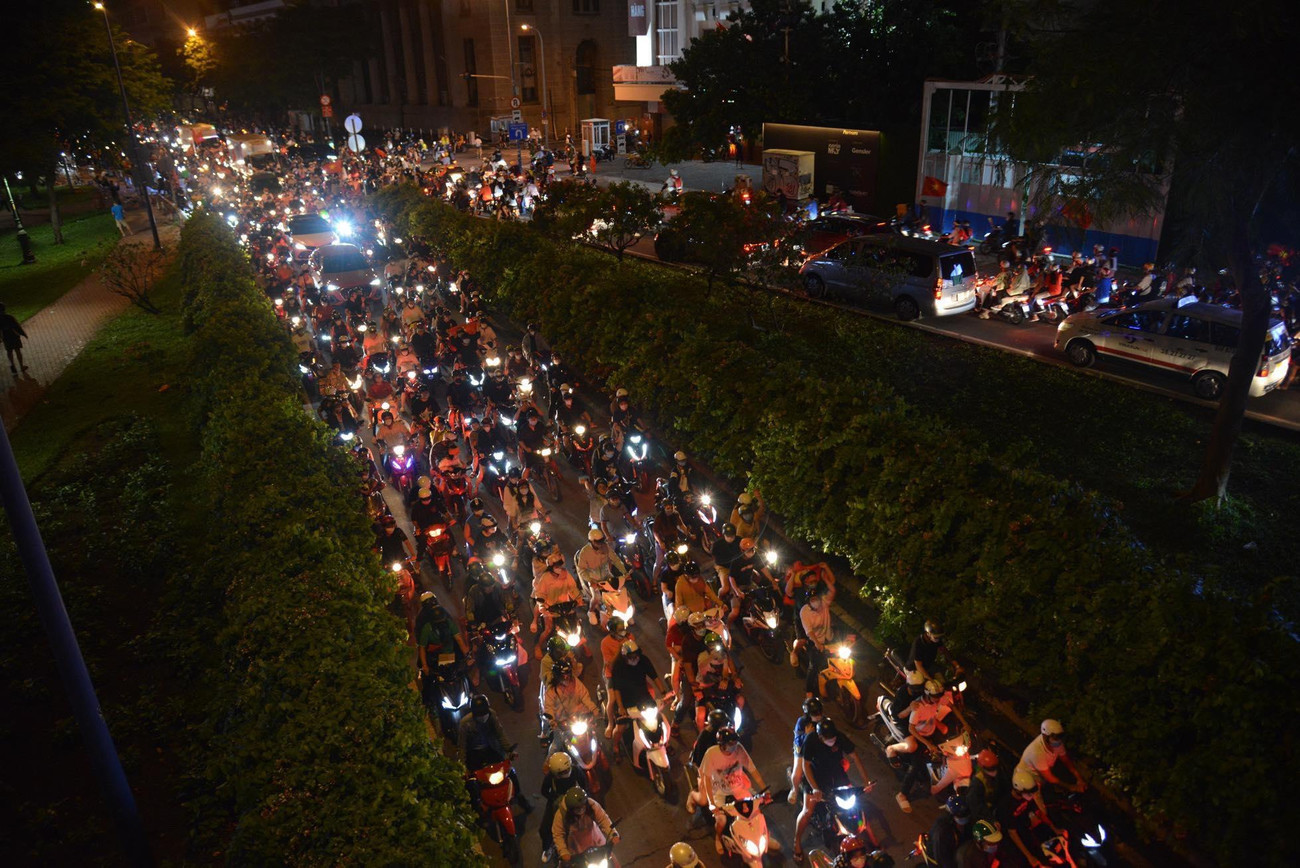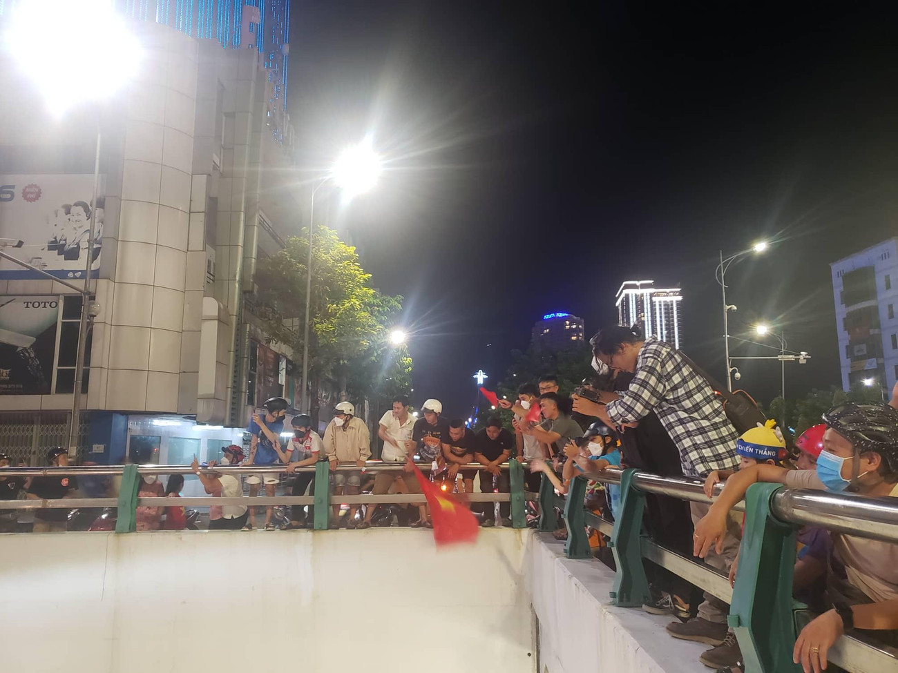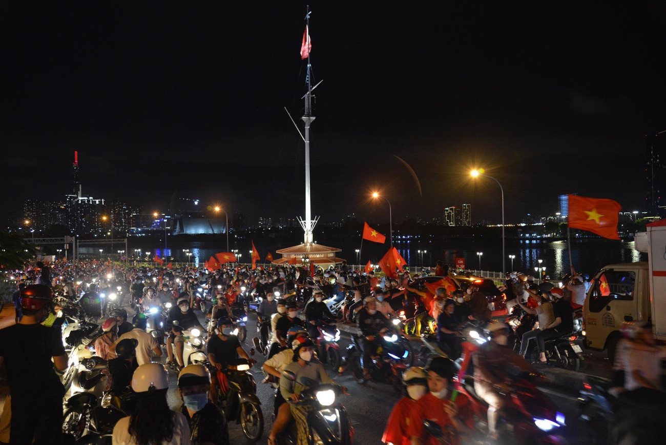 Tại TPHCM, khu vực cột cờ Thủ Ngữ, đoạn dưới cầu Khánh Hội, hàng ngàn người hâm mộ thành phố đã đổ ra đường ăn mừng đội U23 Việt Nam bảo vệ thành công huy chương vàng SEA Games.