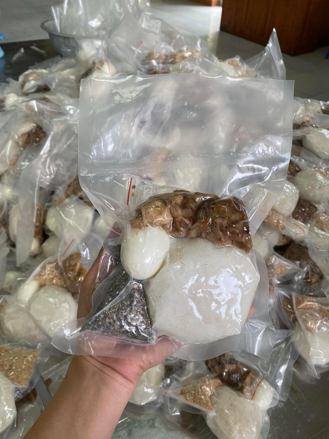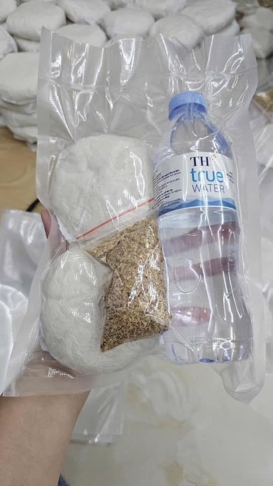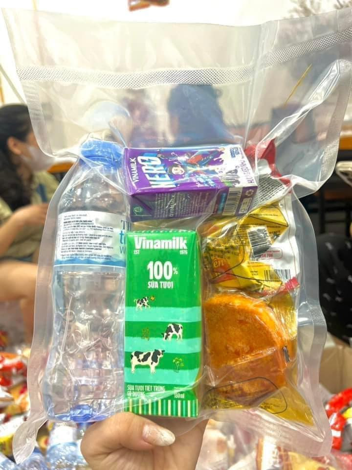 Đồ ăn được chia đều vào các túi nhỏ. Mỗi túi gồm 1 - 2 chai nước lọc kèm đồ ăn, sau đó hút chân không. Đồ ăn đóng gói bằng cách này bảo quản được lâu hơn khi để ngoài trời, lại giúp tối ưu diện tích chứa đồ khi vận chuyển. Túi được hút chân không không bị ngấm nước. Vì vậy, kể cả túi có vô tình hứng mưa hay rơi xuống nước cũng vẫn có khả năng dùng được.