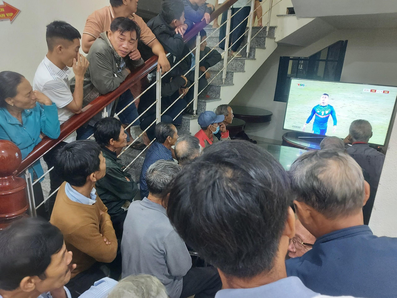 | Người dân trong khu tránh trú bão tập trung theo dõi cổ vũ đội tuyển Việt Nam. |