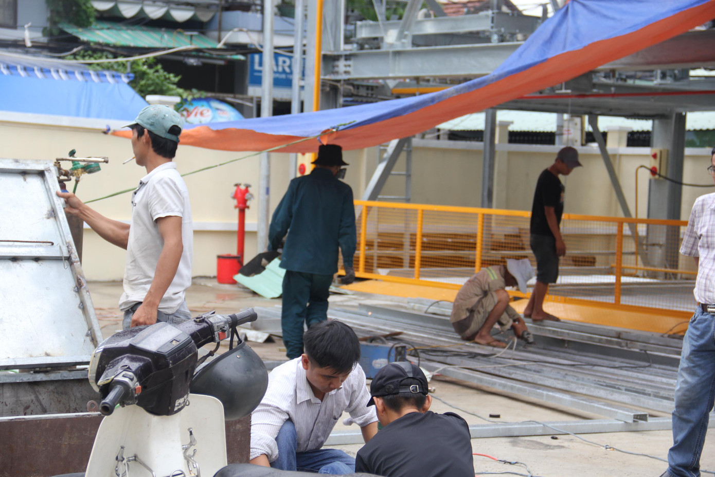 Công nhân đang hoàn thiện các hạng mục phụ tại bãi đỗ xe. Ảnh: Thanh Trần.