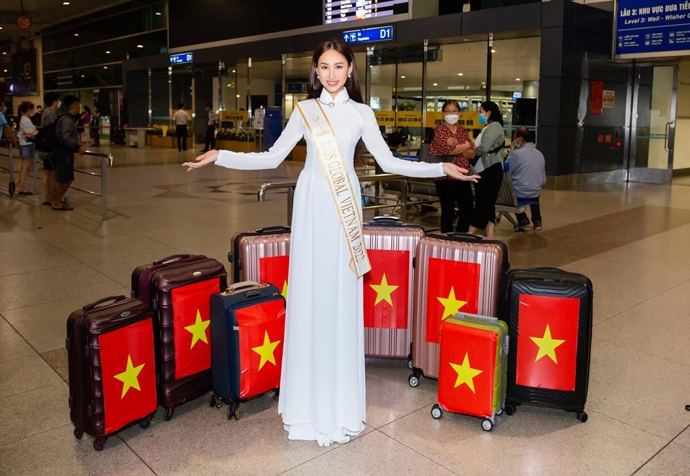 Trung thành với hình ảnh người con gái Việt thuần hậu, dịu dàng, Đoàn Hồng Trang đã chọn một thiết kế áo dài trắng tinh khôi để diện trước khi lên đường.
