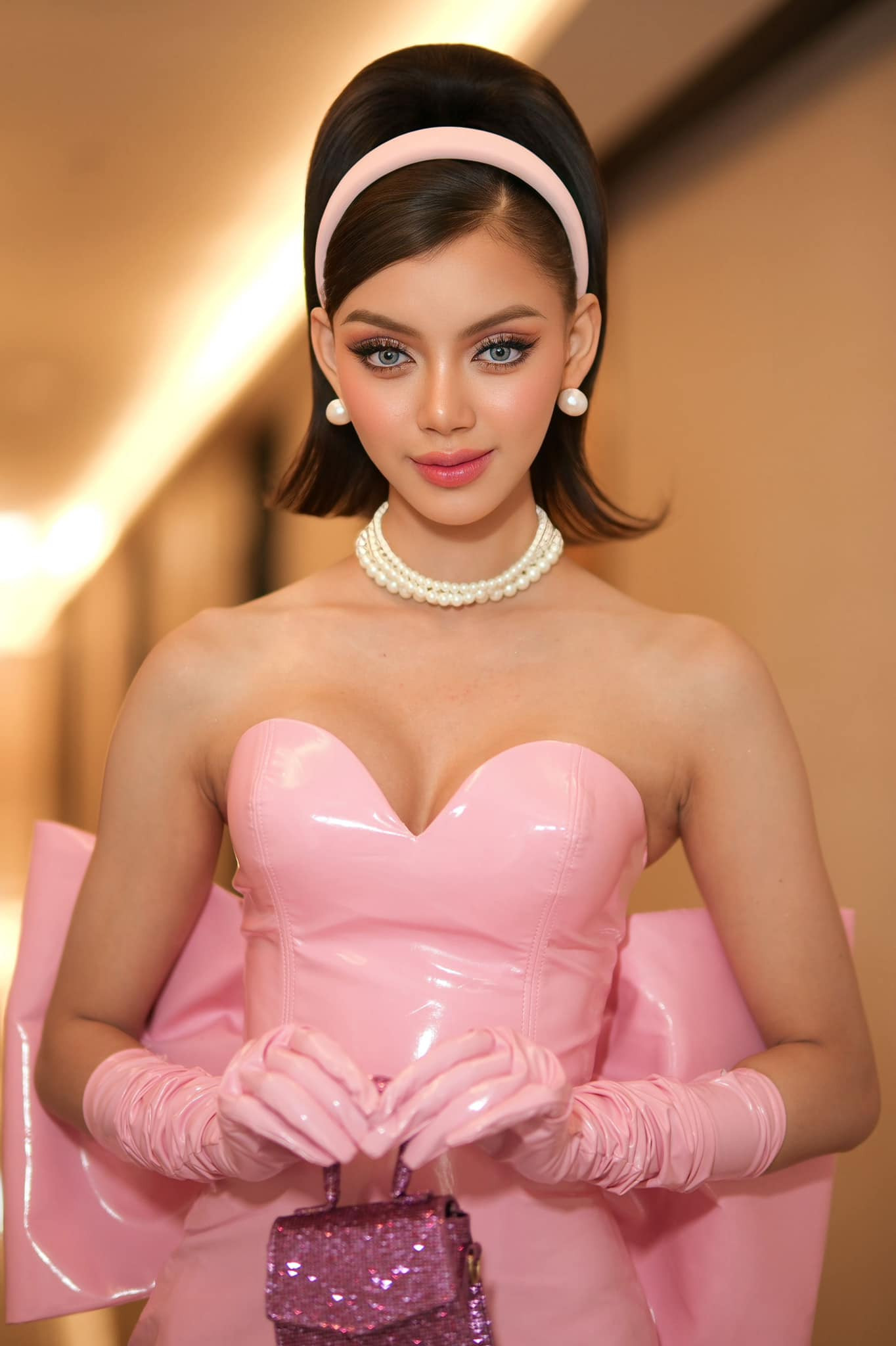 Mới đây nhất, Thae Su Nyein lại gây bất ngờ khi hóa thân thành nàng búp bê Barbie ngọt ngào với váy hồng cúp ngực có nơ cỡ lớn sau lưng, buộc tóc cao kiểu cổ điển và còn đeo thêm kính áp tròng màu xanh. Tạo hình này giúp Miss Grand Myanmar trở nên độc đáo so với các thí sinh khác.