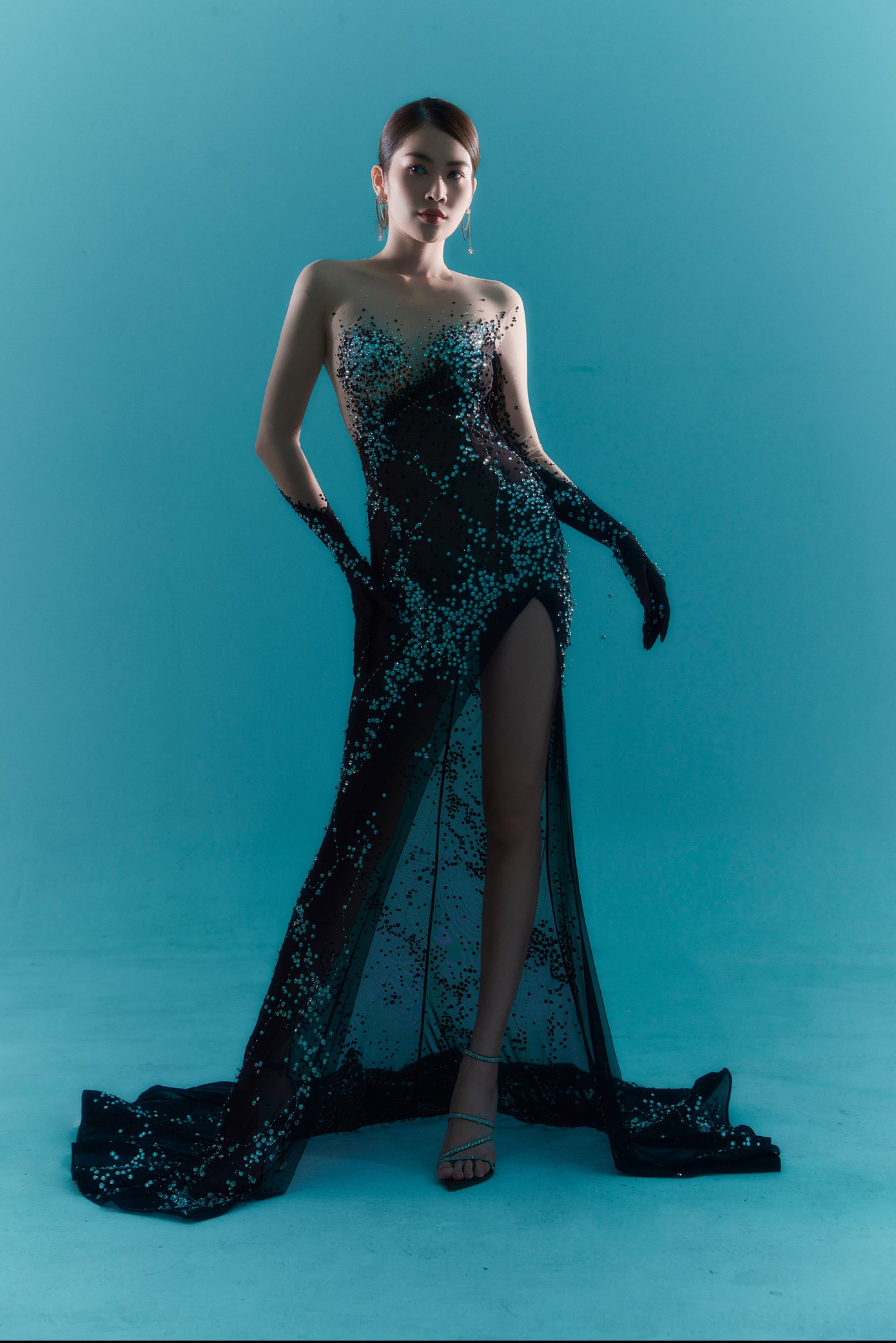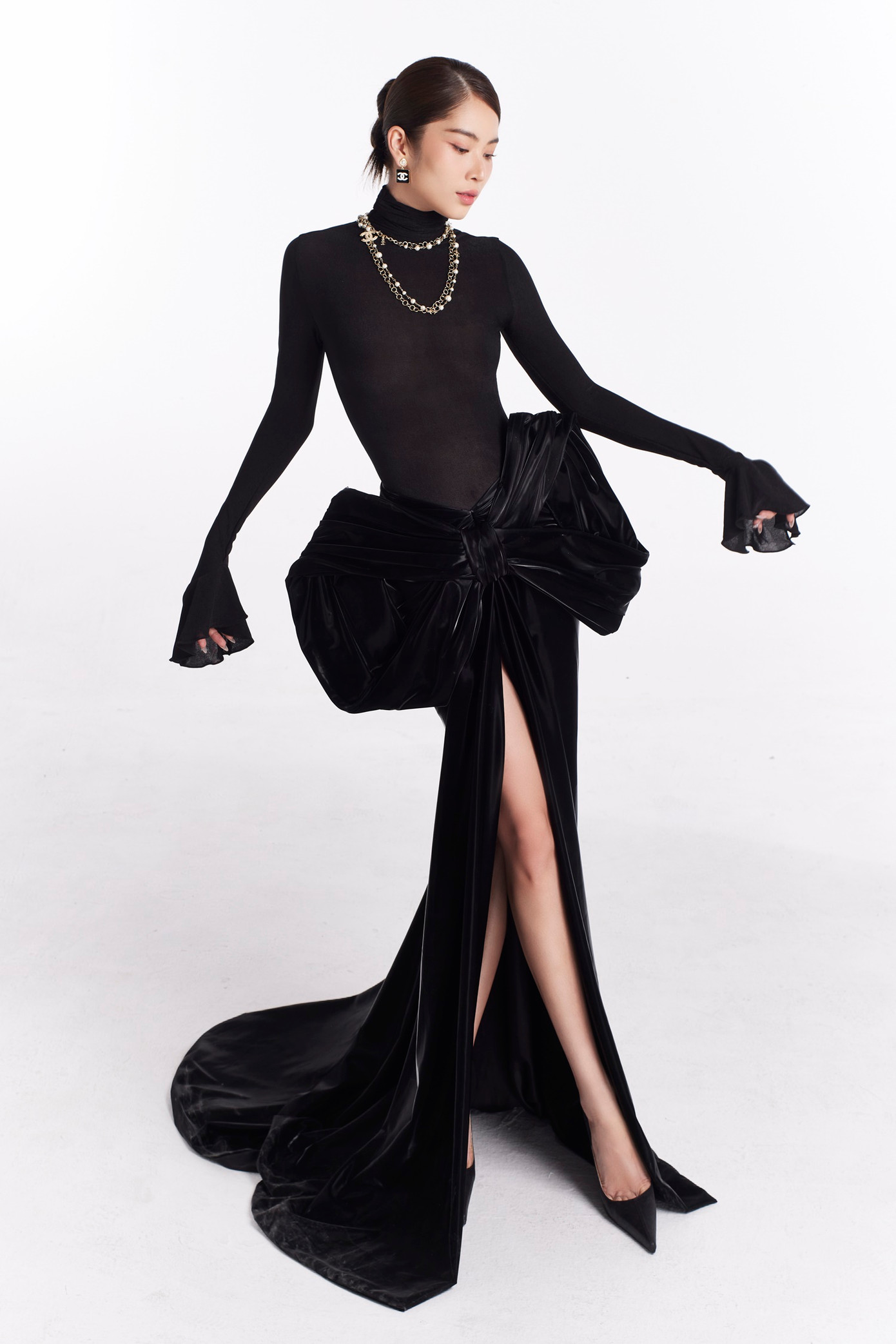 Cô nàng Lệ Nam hóa thân thành đóa hồng nhung rực rỡ với thiết kế dạ hội tinh tế, khoe khéo đôi lưng trần. Ngoài ra, cô còn trở nên huyền bí trong chiếc váy đen xẻ tà, với phần bèo nhúm quanh eo tạo sự mềm mại, nữ tính.